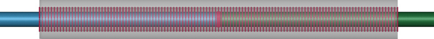 The numerical modelisation of the arrangement in Fig. 7 was carried out using the explicit finite element code in LS-DYNA [19], in order to compare numerical and experimental results. A more detailed representation of the water sample and confinement reservoir are shown in Fig. 8. The model was created in 3D, where the striker bar (yellow in Fig. 7), incident bar (blue in Fig. 7) transmitter bar (green in Fig. 7) and steel reservoir (grey in Fig. 7) were modelled as Lagrangian solid mesh. SPH node modelisation was used to model the water sample (red in Fig. 8) [20‐23].