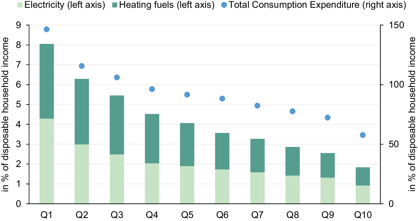 Increasing energy prices are having an impact on both businesses and households. Among households, those with low and lower-middle incomes tend to bear the greatest burden of these price hikes, as they typically spend a much larger proportion of their income on heating fuels and electricity compared to higher-income households (see e.g. Reaños & Wölfing, 2018; Romero-Jordán et al., 2016). As a result, the financial burden of rising energy costs can be particularly severe for these households.