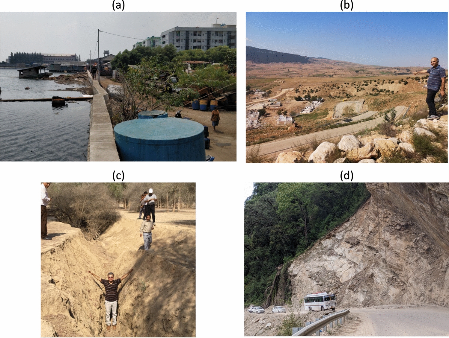 a Seafront of Pluit district in Jakarta (Indonesia), situated a few meters below mean sea level and protected from seawater by a concrete wall that needs to be raised every few years to counteract a land subsidence of 10–20 cm/year due to unsustainable groundwater withdrawal (photo by Pietro Teatini, September 20, 2019). b Damage to buildings and road caused by the March 2019 landslide at Hoseynabad-e Kalpush village in Iran (photo by Mahdi Motagh, July 30, 2019). c An example of a surface fissure due to groundwater extraction in Hormozgan province of southern Iran (photo credit: Mahdi Motagh, June 15, 2017). d A rockslide in the Mandakini Catchment in the Indian Himalayas along the National Highway (photo credit: Alok Bhardwaj, May 11, 2023)