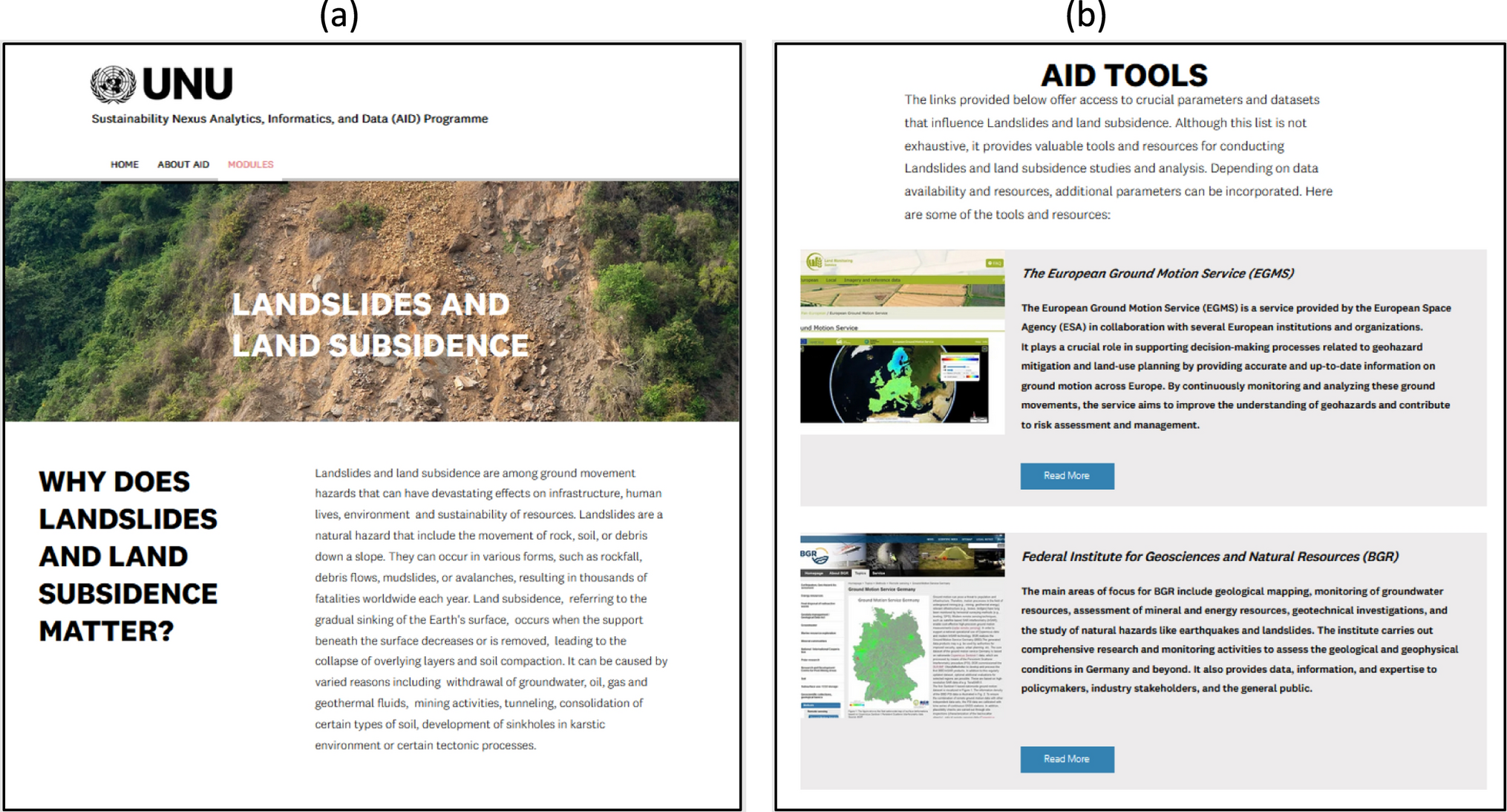 The Landslides and Land Subsidence Module webpage on the UNU Sustainability Nexus AID website, enabling access to a general information on the geological processes and b available AID tools