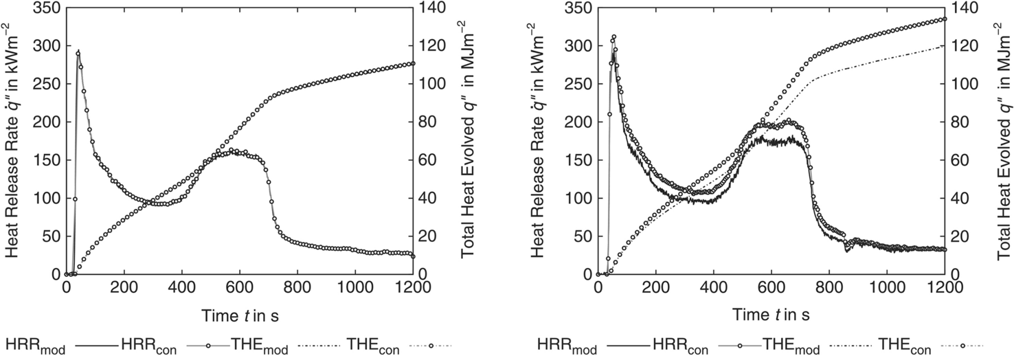 HRR and THE from particleboard samples at 21 vol% O2 (left) and 18 vol% O2 (right) displaying conventional results (subscript con) and the effect of the modified calculation procedure (subscript mod) proposed by Werrel et al. [7].