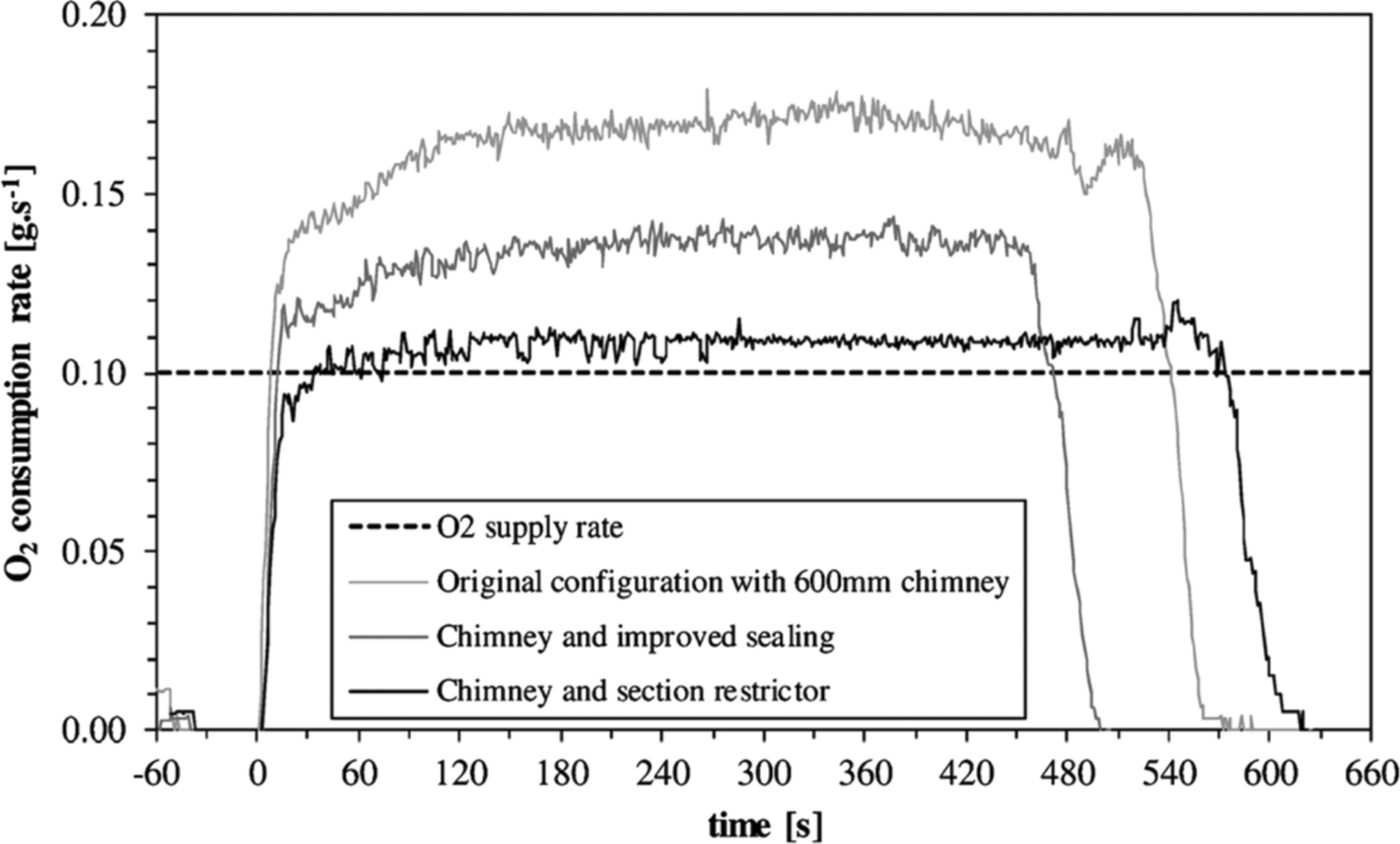 There is no consensus at this stage for operating conditions that are preferable for one of the primary uses of the CACC, namely for the collection of toxic effluent data. For example, recent research into the collection of toxic data for wood species at 50 kW/m2 has used both under-ventilated flow rates of 6 to 28 L/min [21, 23, 24] and vitiated flow rate of 144 L/min [25]. This decision is, however, critical to the toxic species data collected, the conditions replicated, and the challenges faced for apparatus design. The exploration of material decomposition in reduced oxygen environments is not well understood partly because of the limited number of studies focussing on this topic [26]. Further to this, the consideration of how oxygen reduction is introduced is not always well defined within the studies themselves.