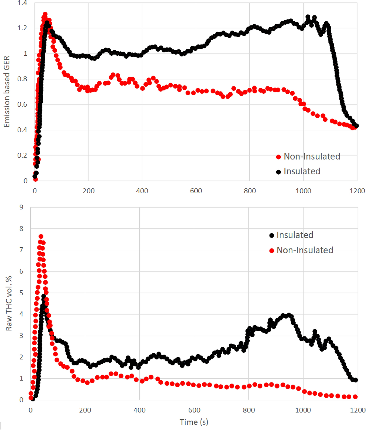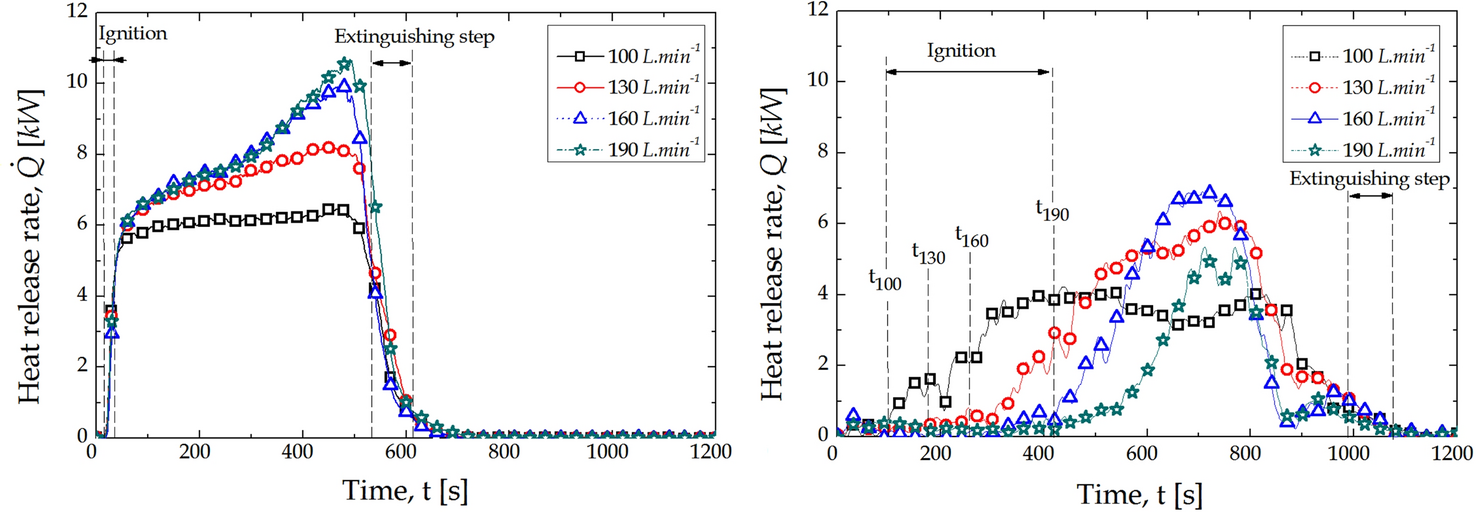 Heat Release Rate, Mass Loss Rate and Effective Heat of Combustion—For many early research papers, the HRR or EHC obtained through open-CACCs using vitiated conditions, as given in Table 2, were calculated based on ISO 5660-1 [57], using the oxygen consumption principle [58]. This method has been shown to overpredict the HRR, particularly in conditions with low oxygen concentrations, and as a result produced incorrect values for EHC [7]. Werrel et al. [7, 59] presented a modified calculation approach that considered incomplete combustion by the generation of CO. Their results using the original calculations in ISO 5660-1 [57], illustrated in Figure 2, show a misleading trend whereby the Total Heat Evolved (THE) was shown to rise in vitiated conditions. The corrections to the calculation procedure proposed by [7], now included in ISO/TS 5660-5 [10], report that THE had no dependence on oxygen concentration as would be expected.