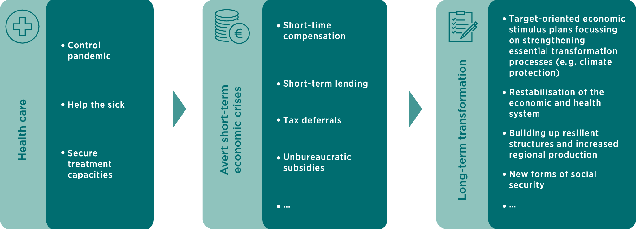 In the third phase, it is particularly important to skillfully direct the necessary economic aid and to systematically exploit synergy potentials for investments that are necessary anyway. If economic stimulus packages are launched as a follow-up to or accompanying the Corona crisis, it is important that these are developed with a direct focus on the future and that the funds spent are not distributed without explicit targeting. In other words: clear criteria are needed to which the measures can be aligned. Whereas, in accordance with the phase concept (cf. Fig. 2), the short-term aid required has a rapid effect and must therefore be pragmatically oriented, the longer-term aid measures offer a unique opportunity not only to trigger economic stimuli but also to be able to set clear accents in the sense of a sustainable and robust design of the economy and society.