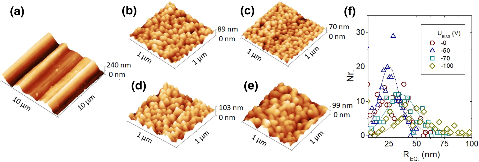 AFM height image of rolled Ni substrate (a), small area scan on the AlN layer deposited with Vbias of 0V (b), − 50 V (c), − 70 V (d), − 100 V (e) and the corresponding grain size distributions (f)