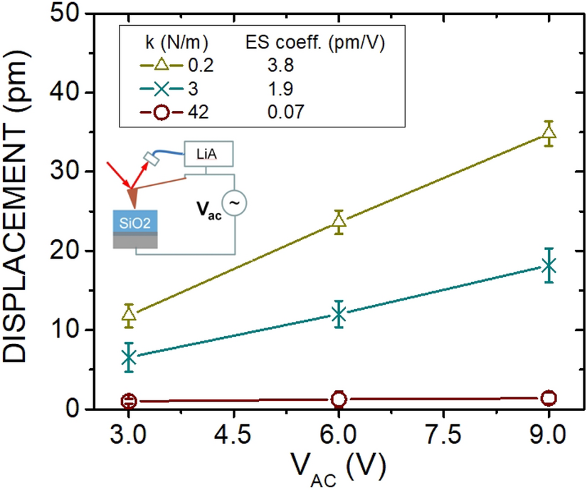 From the equation above one can see that the effect of the electrostatic force can be eliminated by application of proper Vdc, or by the use of a stiff cantilever. We used a 1.3 μm thick oxide thermally grown on p-silicon, i.e., non-piezoelectric sample to show the benefit of stiff cantilever. Figure 2 shows the displacement measured using cantilevers with different spring constants as a function of Vac. Since Vdc cannot be set in our scanning probe system, only Vac was applied. For each Vac bias 100 acquisitions with 100 ms acquisition time were recorded at the same position of the sample surface. Because of the smooth surface and excellent homogeneity of the SiO2 thin films no area averaging was needed, in contrast to the polycrystalline AlN films.