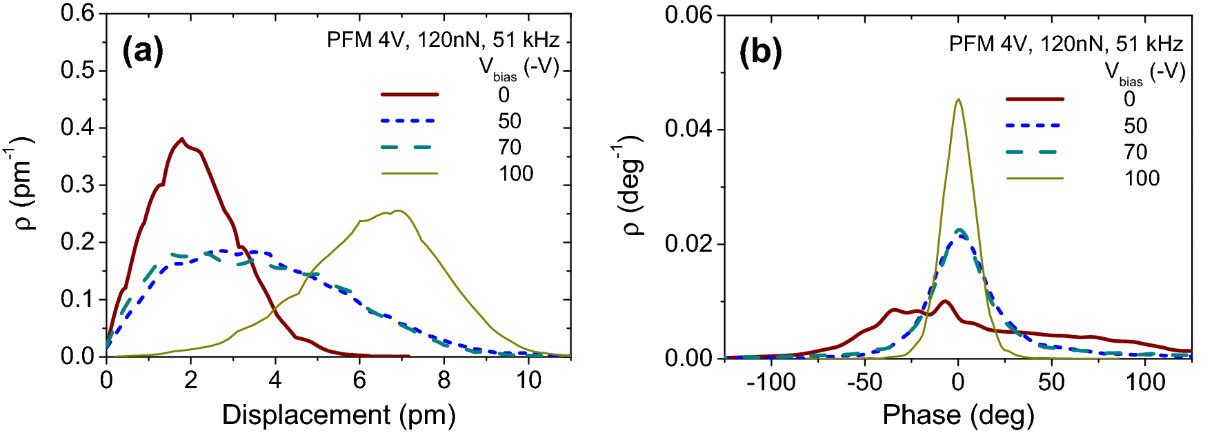 The distribution of PFM response gives information on the homogeneity of the layer. The narrower the distribution, the more homogeneous the layer is. In the present case the phase output of the lock-in amplifier was manually shifted to 0 to ease the comparison (Fig. 4b). The y-axis represents the probability density function for which the integration over the entire displacement space equals to 1. The amplitude distribution of unbiased sample is at the background level, while its phase distribution is extremely wide. As bias voltage increases, the layer becomes more and more homogeneous, i.e., the phase distribution is narrower and higher. Though the displacement distribution peak of unbiased sample is narrow, and high, it is due to the fact that it contains mainly the background. Interestingly, increasing substrate bias from 50 to 70 V has almost no effect on the amplitude and phase distribution. For the best sample (Vbias = −100 V) the mean displacement is c.a. 6.5 pm at VAC = 4 V, and the FWHM of phase distribution is about 22°.