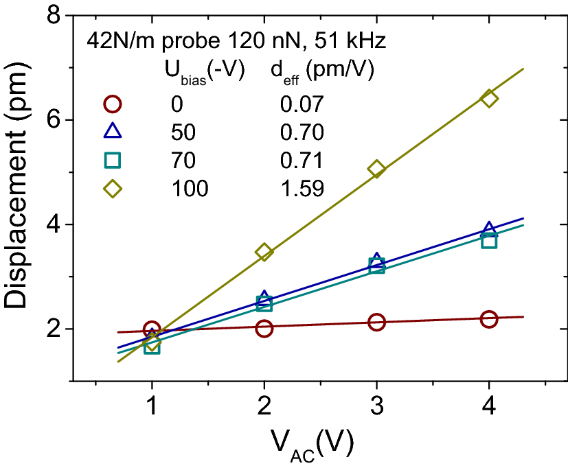 The second origin of the underestimated piezocoefficient is the tip-shape effect, i.e., the electrostatic field below the sharp tip is not homogenous and depends on the radius of the tip, in contrast to the macroscopic piezometer technique which can be described by a parallel plate capacitor model. To correct this effect, a second correction was performed using a Z-cut LiNbO3 single crystal (z-LN) reference with a thickness of c.a. 300 µm. The displacement of z-LN surface as a function of exciting Vac is presented in Fig. 6, from which the effective coefficient obtained by linear fitting is 4.1 pm/V which is smaller compared to the intrinsic one of z-LN (6.2 pm/V) [42]. We note that the clamp effect mentioned above is not the case here, because the crystal is much thicker than the thickness limit of the layer, within which the clamp effect is valid [29]. Taking into account the clamp effect and the calibration on z-LN a consolidated correction factor of Ccons = 6.2/4.1 × Cclamp = 2.12 was calculated.