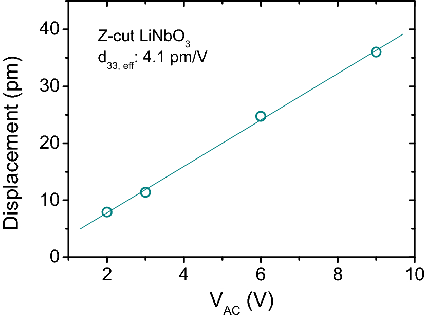 Displacements as a function of exciting Vac for 300 µm thick Z-cut LiNbO3 single crystal. The slope of the linear fit gives the effective piezoelectric coefficient shown in the legend