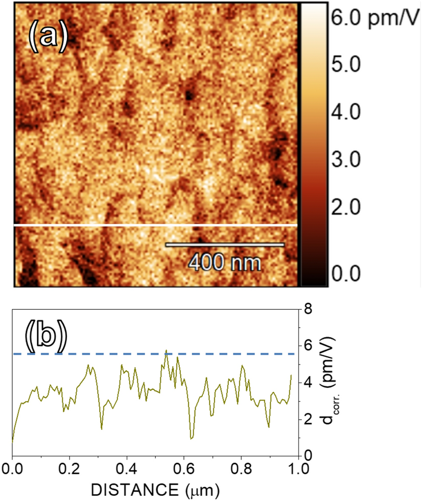 Corrected d33 map of AlN film deposited at − 100 V substrate bias (a), and a characteristic line-cut (b) along the white line. Dashed line indicates the d33 piezoelectric coefficient of bulk AlN