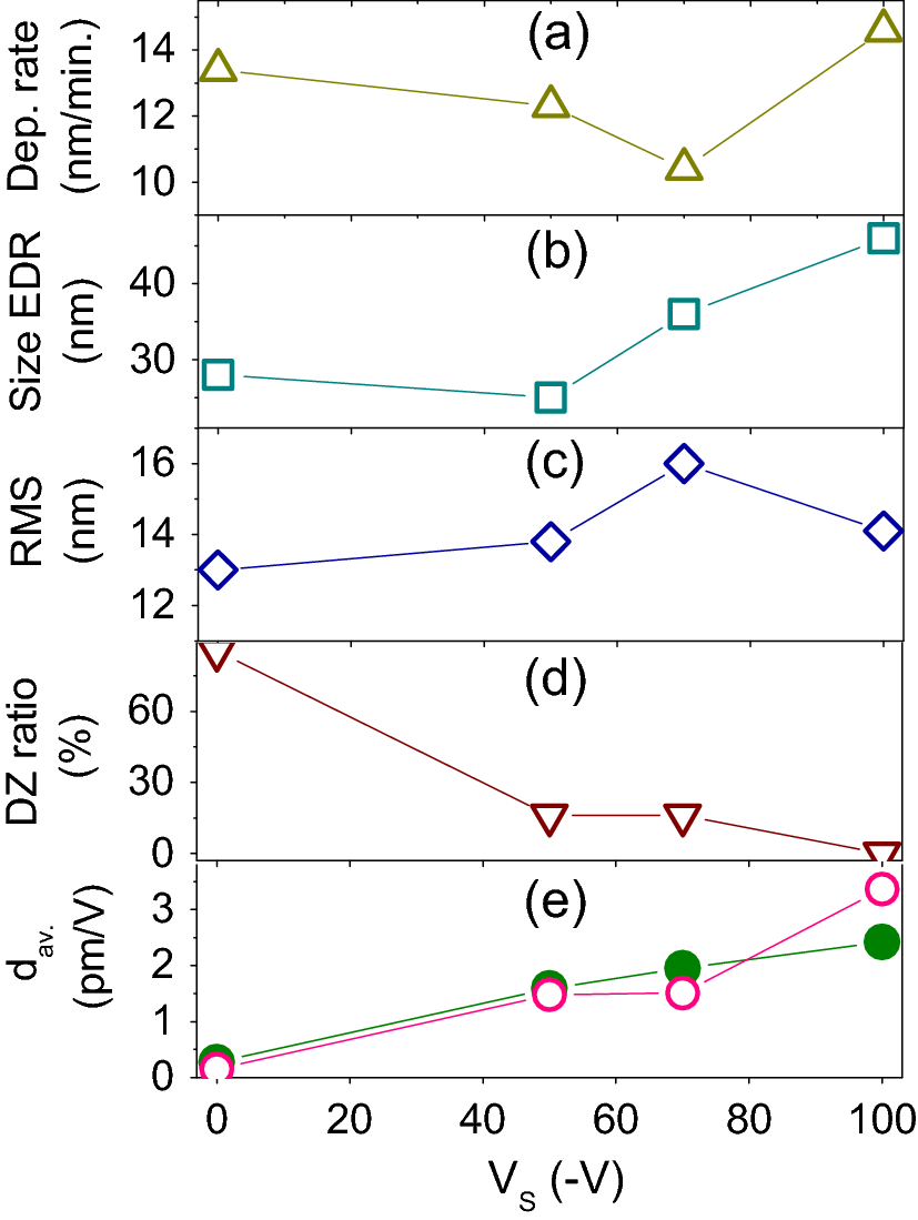 Deposition rate (a), grain size (equivalent disk radius) (b), surface roughness (RMS) (c), dead zone ratio (d), and corrected average piezoelectric coefficient (e) as a function of substrate bias voltage. Piezoelectric coefficient measured by macroscopic method (Piezometer) also shown in (e) for comparison (green dots)