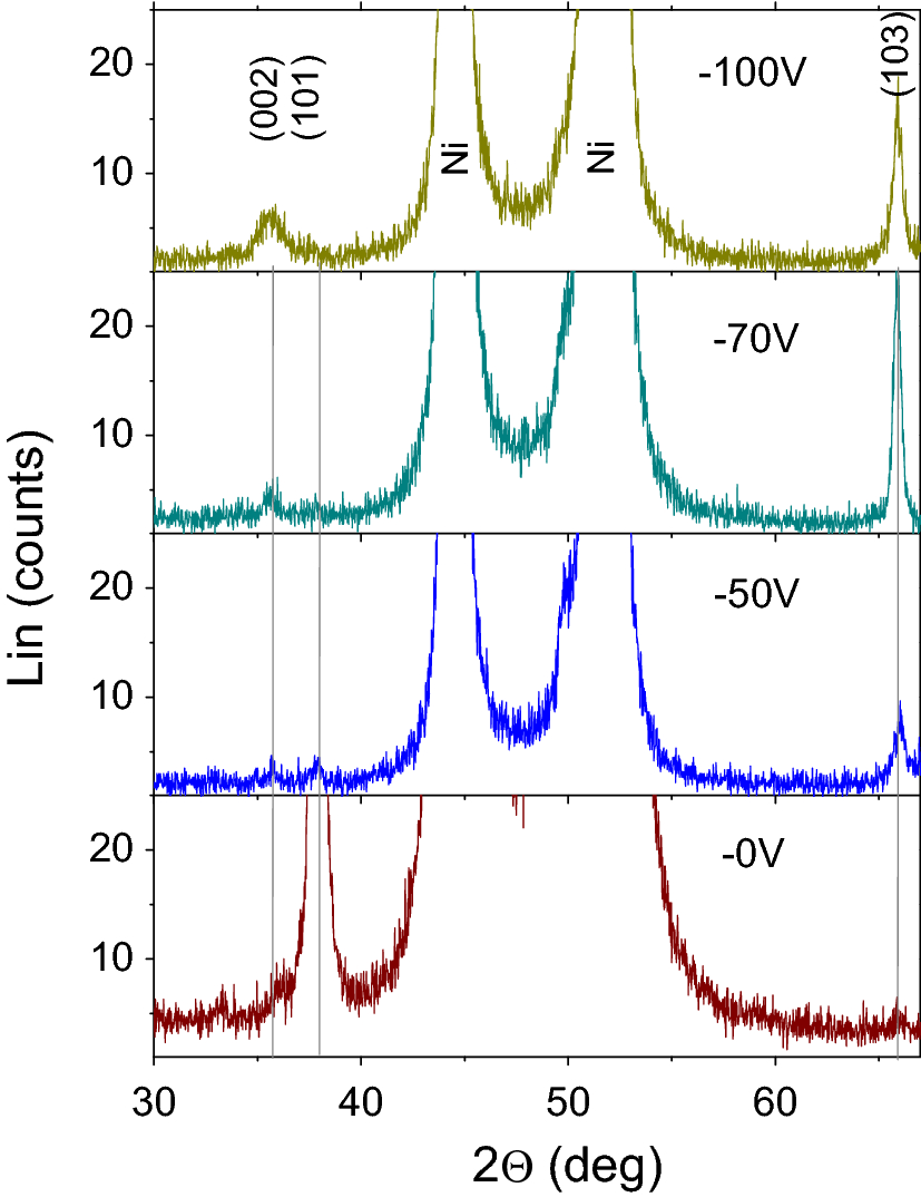 In a few MEMS applications metal substrate is a viable alternative of Si where the high fracture toughness, low substrate and micromachining costs are concerned. For example, unimorph piezoelectric energy harvesters, which convert mechanical energy into electricity, require a relatively large area, high mechanically robustness therefore laser cut metal film, such as stainless steel [18] or Ni is a reasonable choice. Generally, a substrate heating of c.a. 500 °C is applied during the growth of AlN to improve its crystal quality via enhancing the surface diffusion [9, 16, 19, 20]. However, in the case of Ni sheet, the substrate heating is not applicable due to the high difference of thermal expansion coefficient between Ni substrate (13 × 10−6 K-1) [21] and AlN (4.2 × 10−6 K−1) [22]. So one can expect that as the sample cools down from high temperature after deposition, the adhesion between AlN layer and Ni substrate can degrade significantly, even AlN layer can detach from Ni substrate, which makes the application of such structure for vibration energy harvester impossible. For this reason, we have applied the new approach, namely the negative bias on Ni substrate during deposition of AlN layer at room temperature. The substrate bias can affect the quality of deposited layer via the impact of the energetic ions on the sample surface [16, 23‐25]. By increasing the energy supplied to the film the surface diffusion can be enhanced, leading to an increase in the mean distance which the adatoms can travel, reaching the lowest energy sites [26], thus results in an improved crystal growth. In return, one may expect the resputtering at the substrate, which may decrease the rate of the AlN layer deposition.