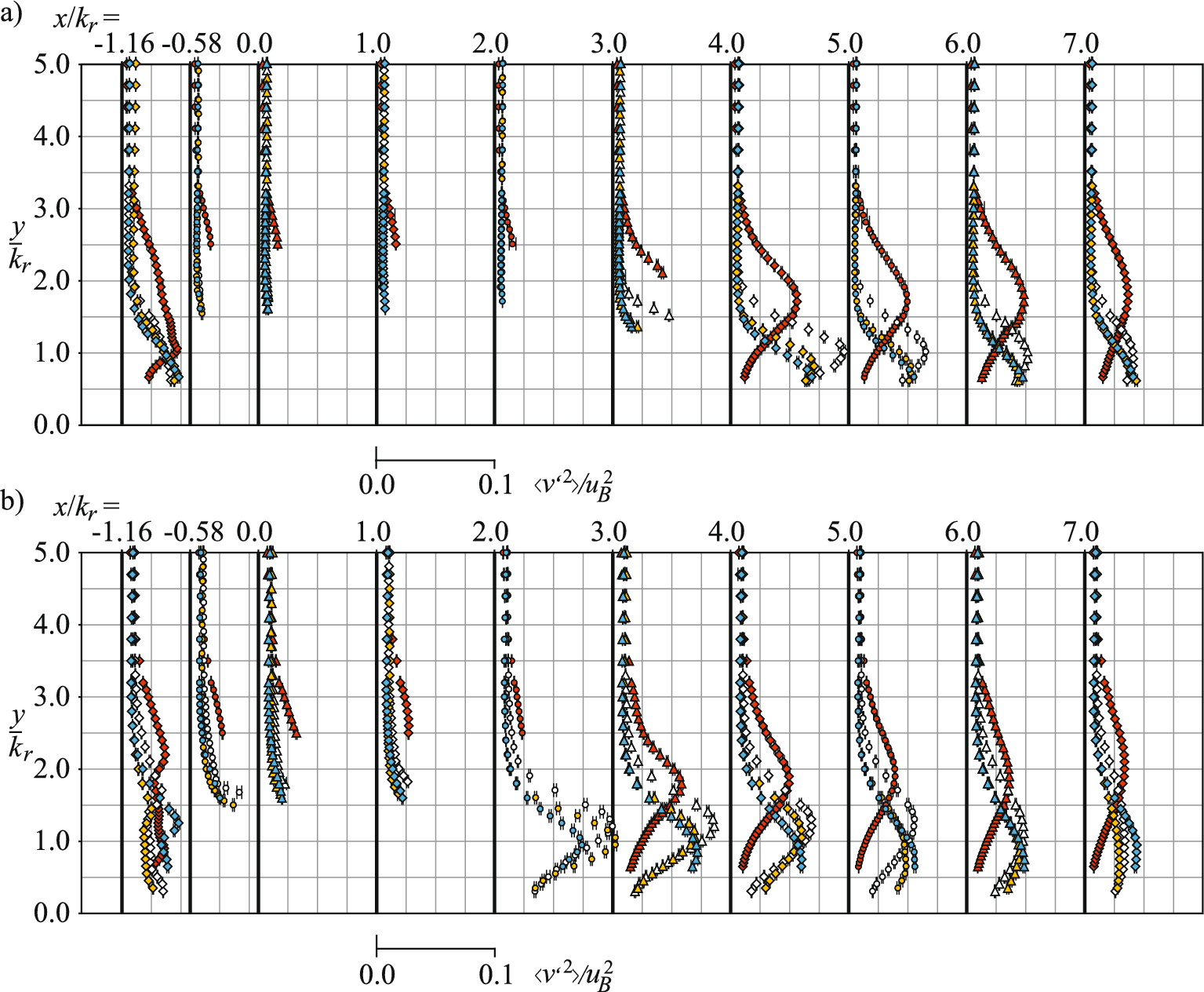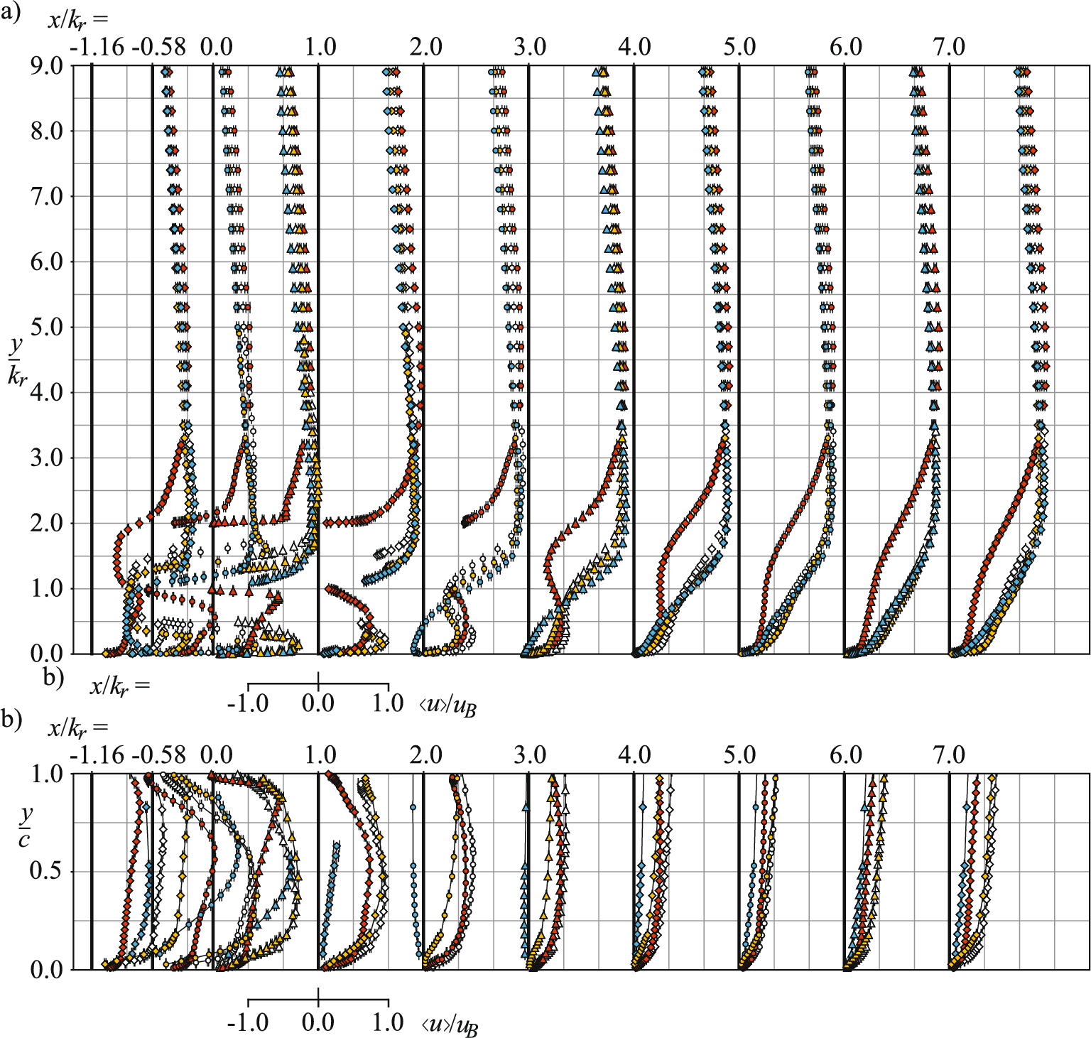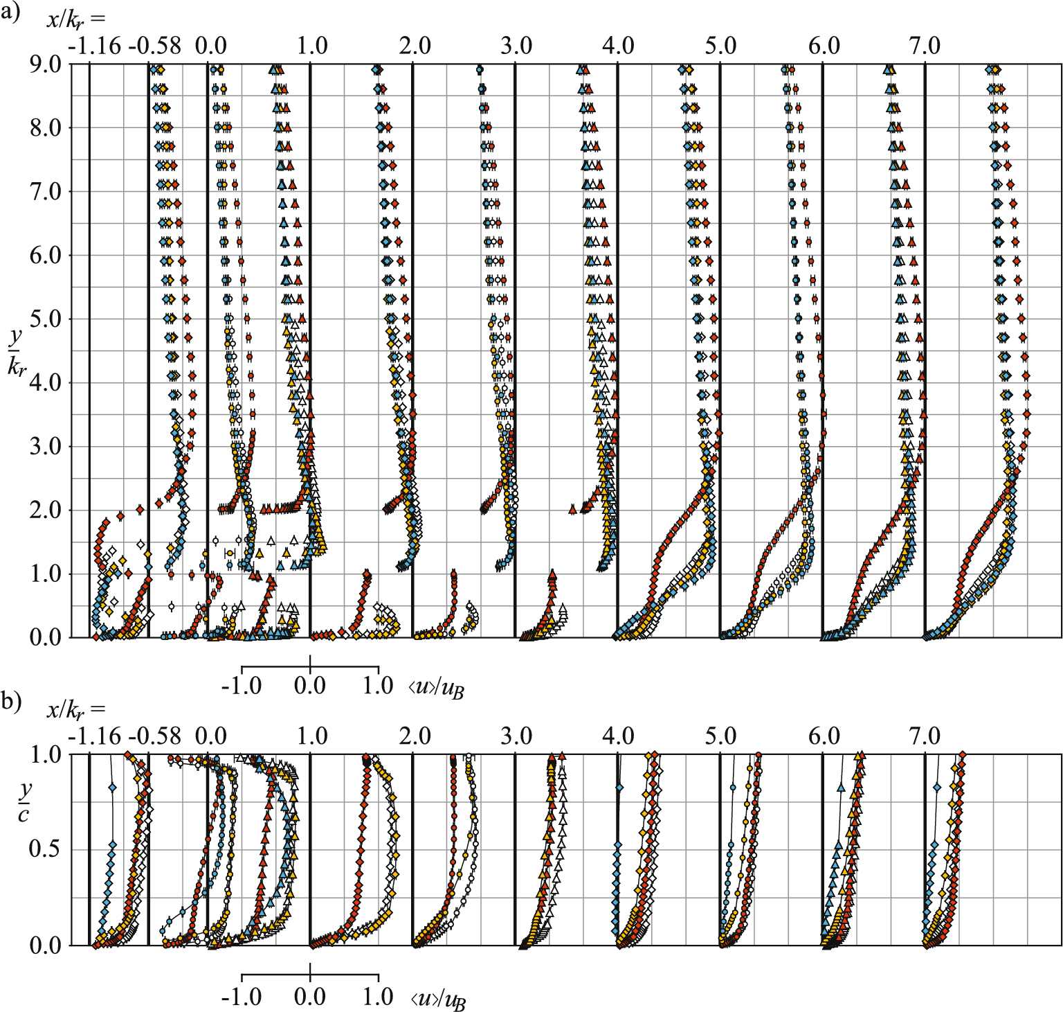Since the fluid was also deflected downward at the windward rib surface, development of secondary flow structures in the gap below the ribs was expected. However, flow velocity in the gap was measured in one dimension only due to the limitations of the field of view of the measuring system and the geometry. This hardly allows any conclusions to be drawn with respect to a possible three-dimensional secondary flow below the ribs. Nevertheless, the increase of \(\langle v\rangle \) in the region below the rib crest (Fig. 4 (\(c/k_r=0.3\)), Fig. 7) as well as the lateral variations of \(\langle u\rangle \) in the gap (Figs. 5b and 6b) and the near-wake could be hypothetically attributed to a geometry-induced secondary flow that develops below the rib crest and significantly influences the wake, despite the secondary flow field above.