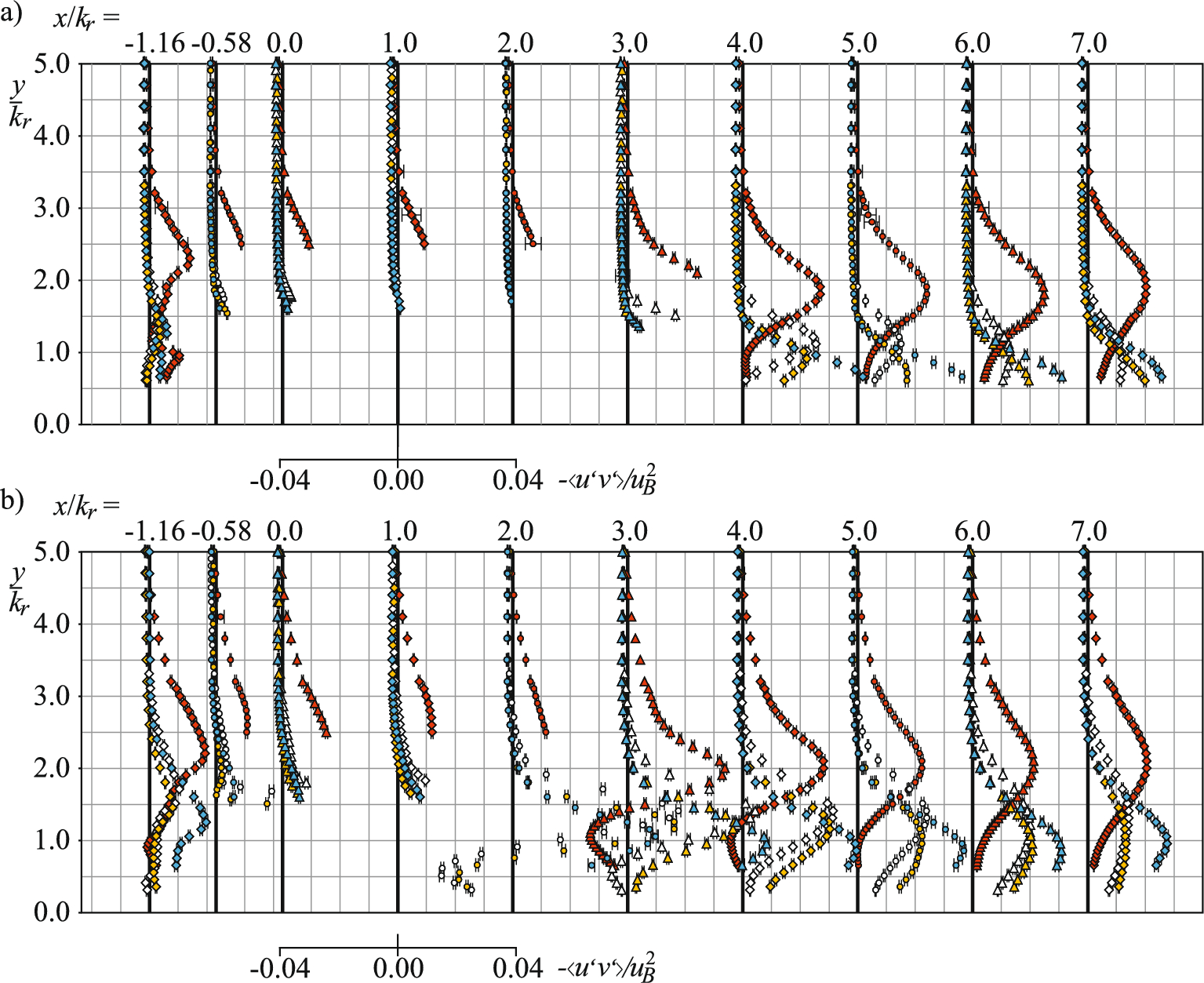 Normalized Reynolds shear stress \(-\langle u'v' \rangle /u_B^2\) at different axial positions for \(c/k_r=0.1\), \(c/k_r=0.3\), \(\lozenge \,\circ \vartriangle \)\(c/k_r=0.5\), and \(c/k_r=1.0\) in the (a) \(z/H=0.0\)-plane and (b) \(z/H=0.25\)-plane