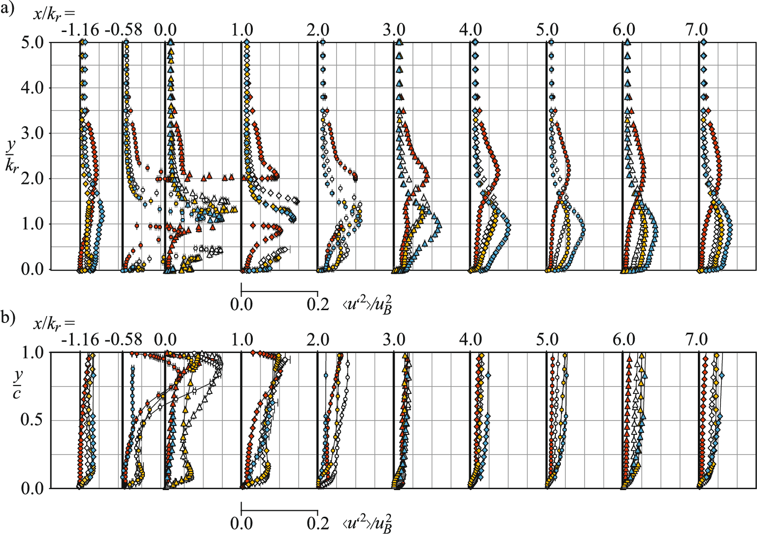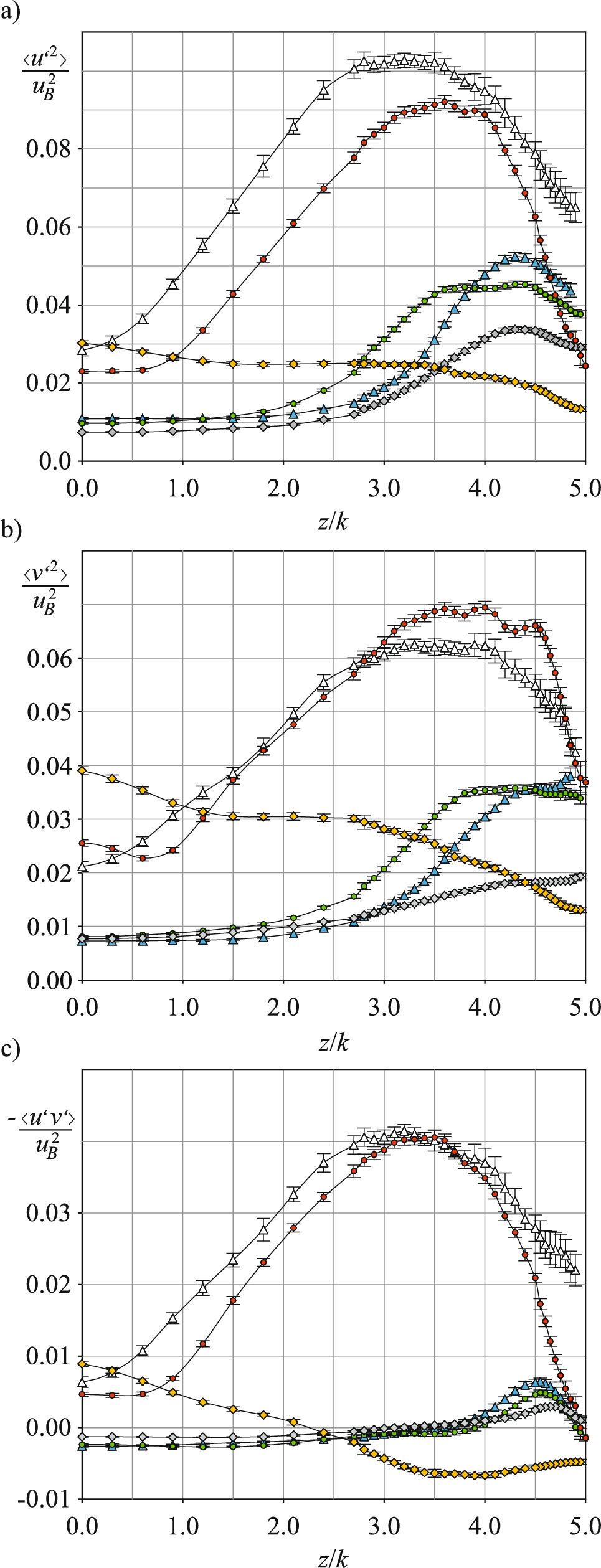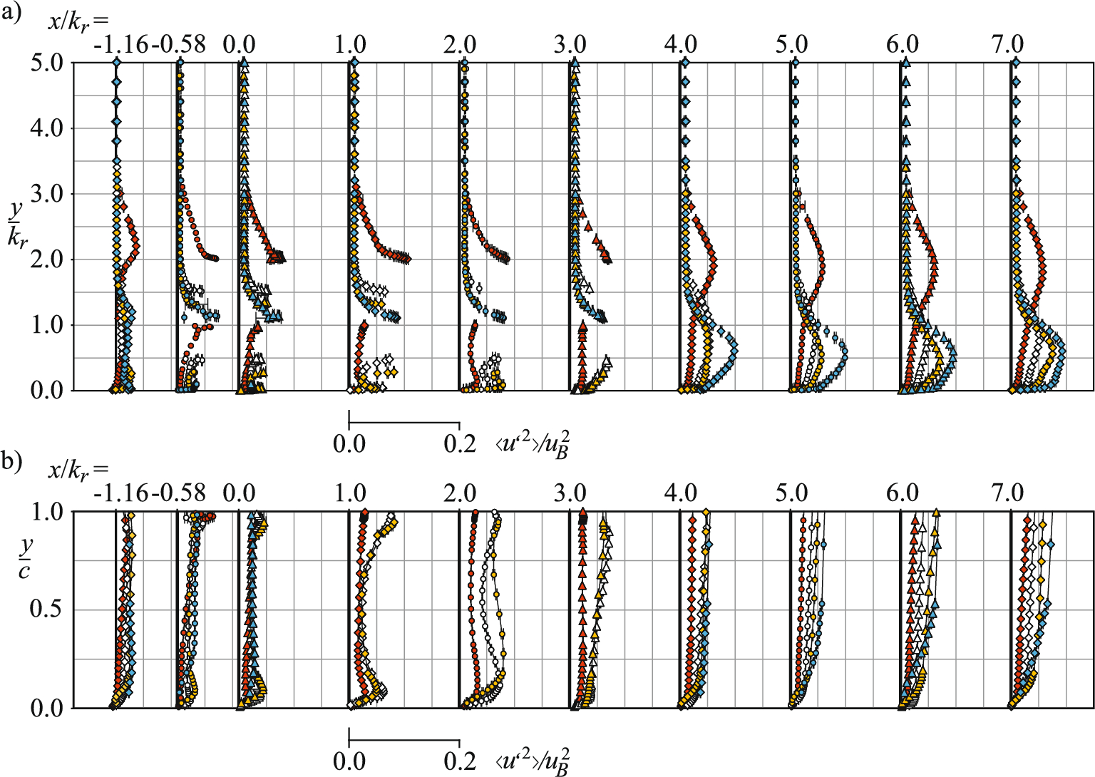 Normalized (a) axial Reynolds normal stress \(\langle u'^2\rangle /u_B^2\), (b) vertical Reynolds normal stress \(\langle v'^2\rangle /u_B^2\), and (c) Reynolds shear stress \(-\langle u'v' \rangle /u_B^2\) measured along lines parallel to the z-axis at \(x/k_r=4.0\), \(y/k_r=1.3\) for \(\vartriangle \hspace{1mm}c/k=0.1\), , and and at \(x/k_r=4.0\), \(y/k_r=5.0\) for , , and