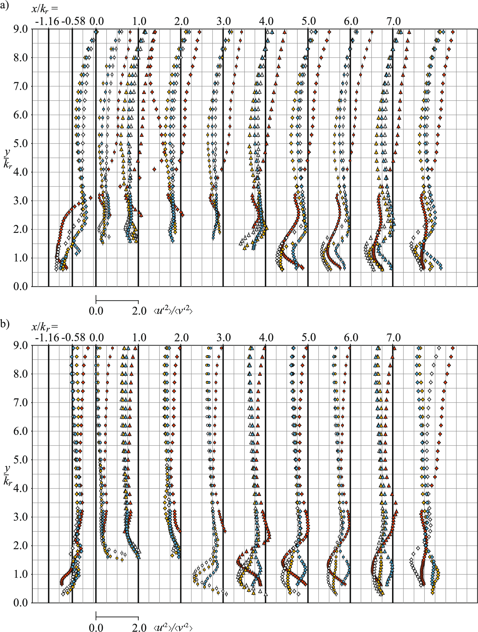Reynolds stress ratio \(\langle u'^2 \rangle /\langle v'^2 \rangle \) at different axial positions for \(c/k_r=0.1\), \(c/k_r=0.3\), \(\lozenge \,\circ \vartriangle \)\(c/k_r=0.5\), and \(c/k_r=1.0\) within the (a) \(z/H=0.0\)-plane and (b) \(z/H=0.25\)-plane