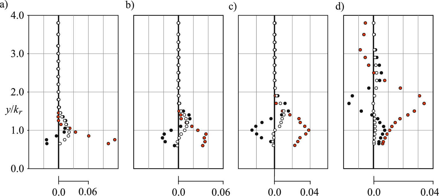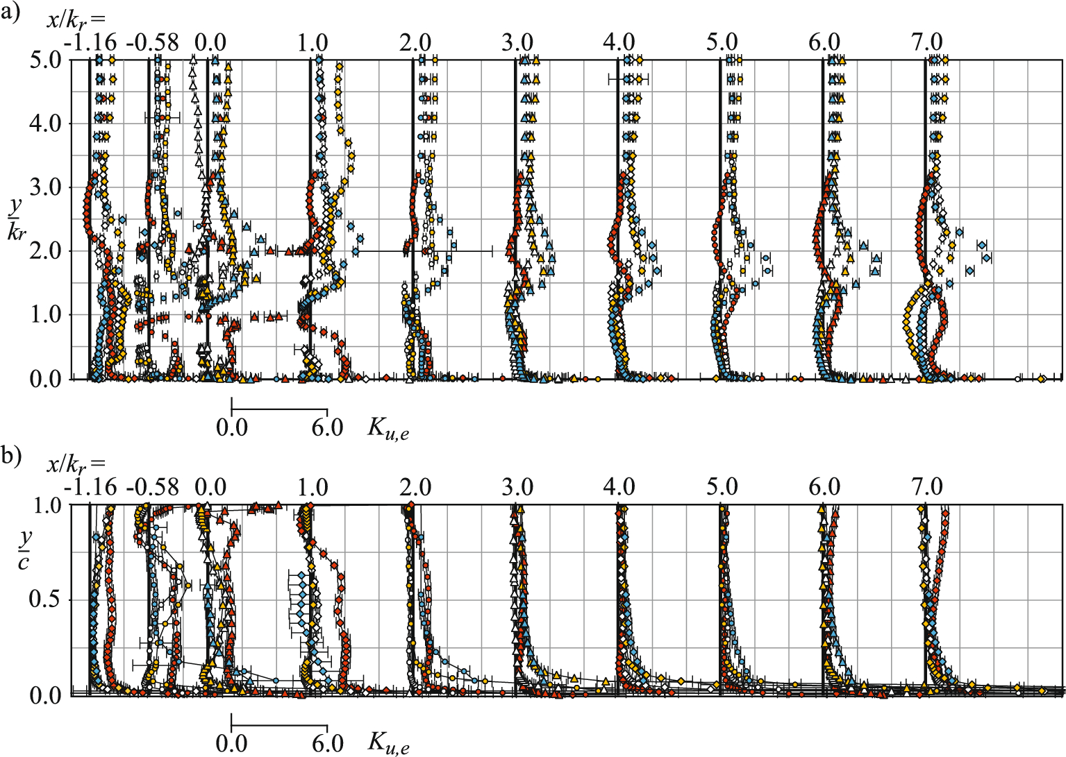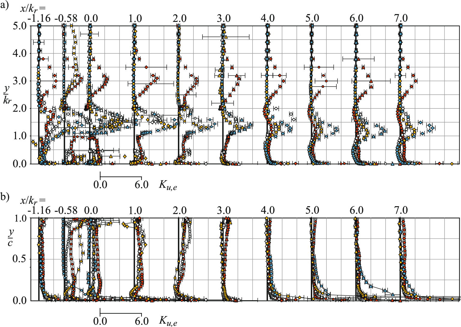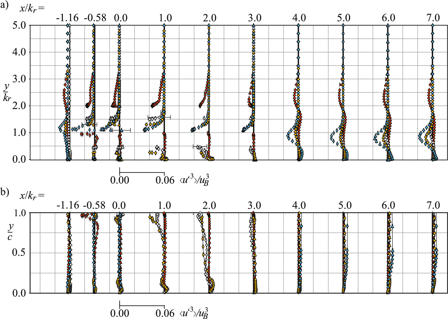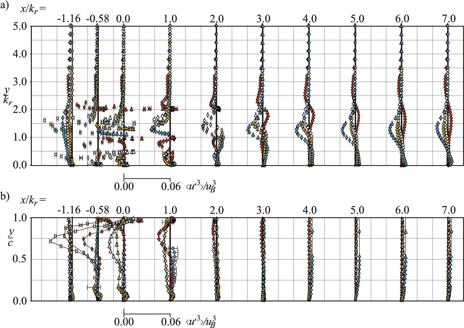 Starting from the outer edge of the upper free shear layer, skewness increased with increasing proximity to the wall and changed its sign from negative to positive in the wake. The sign change of the skewness (Figs. 21 and 22) occurred close to the region where Reynolds shear stress \(-\langle u'v' \rangle \) (Fig. 11 a and b) reached its maxima for all \(c/k_r\). Further zero-crossings of the skewness for \(c/k_r=1.0\) at \(x/k_r=3.0\) and 4.0 in the \(z/H=0.25\)-plane corresponded to the Reynolds shear stress minimum. The reduced skewness resulted from an intense momentum exchange in this region without a prevailing temporal dominance of high-speed or low-speed streamwise velocity fluctuations. The slightly flat-top shaped probability density function indicated by an excess kurtosis of \(K_{u,e}<0\) in this region was a further consequence of the intense mixing suppressing large-amplitude velocity fluctuations or intermittent flow nature. Interestingly, positive skewness peaks occurred in the wake at \(x/k_r\ge 3.0\) for \(c/k_r=1.0\). Following the analysis of cylinder wake flows (Fabris 1983), the positive skewness peaks resulted from the movement of turbulent structures which entrained high-speed fluid by their rotational motion at the shear layer edges and carried it toward the wake.