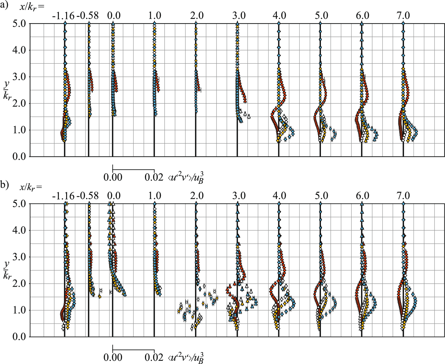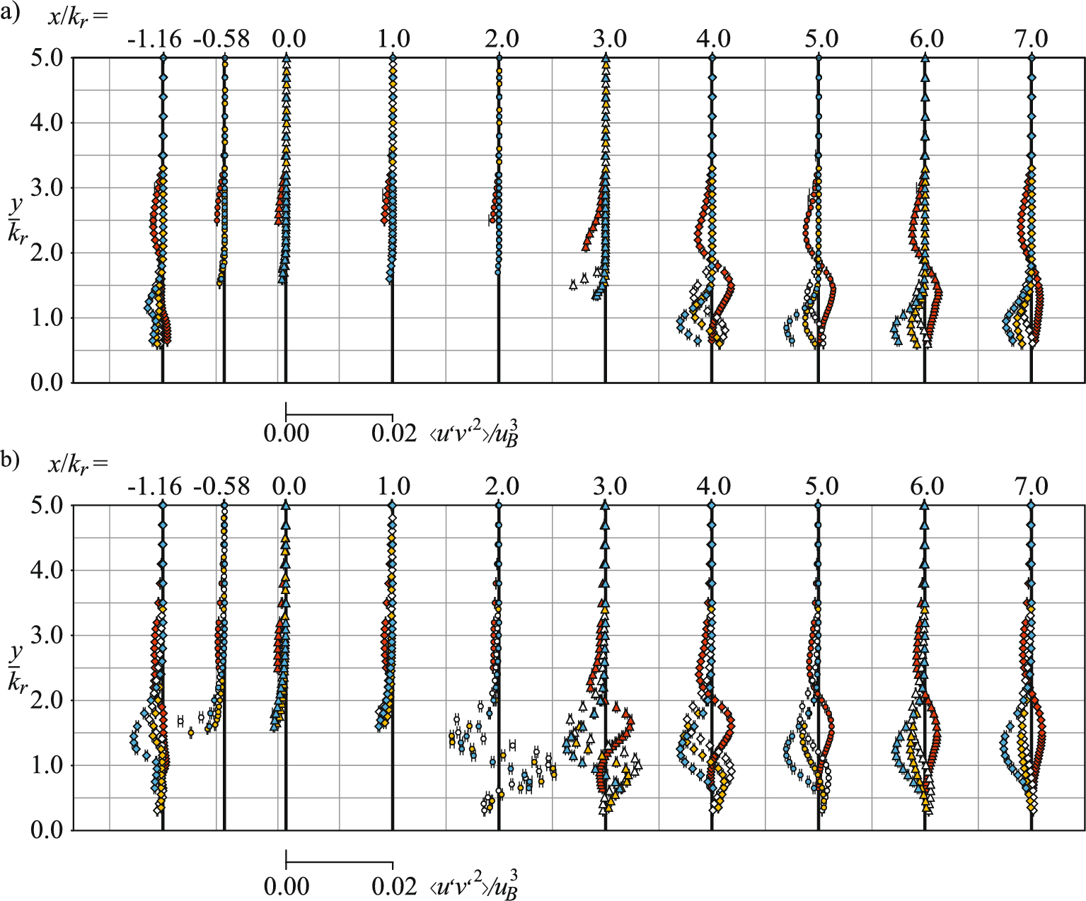 Normalized triple correlation \(\langle u'v'^2 \rangle /u_B^3\) at different axial positions for \(c/k_r=0.1\), \(c/k_r=0.3\), \(\lozenge \,\circ \vartriangle \)\(c/k_r=0.5\), and \(c/k_r=1.0\) within the (a) \(z/H=0.0\)-plane and (b) \(z/H=0.25\)-plane