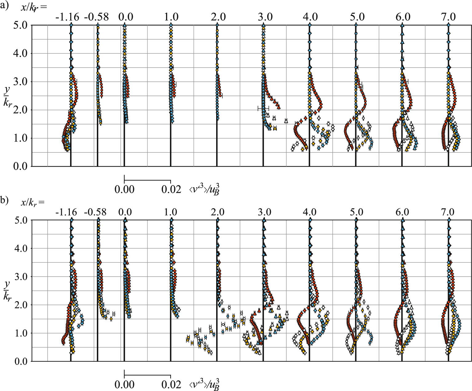 Normalized triple correlation \(\langle u'^3\rangle /u_B^3\) at different axial positions (a) over the duct and (b) within the gap for \(c/k_r=0.1\), \(c/k_r=0.3\), \(\lozenge \,\circ \vartriangle \)\(c/k_r=0.5\), and \(c/k_r=1.0\) within the \(z/H=0.25\)-plane