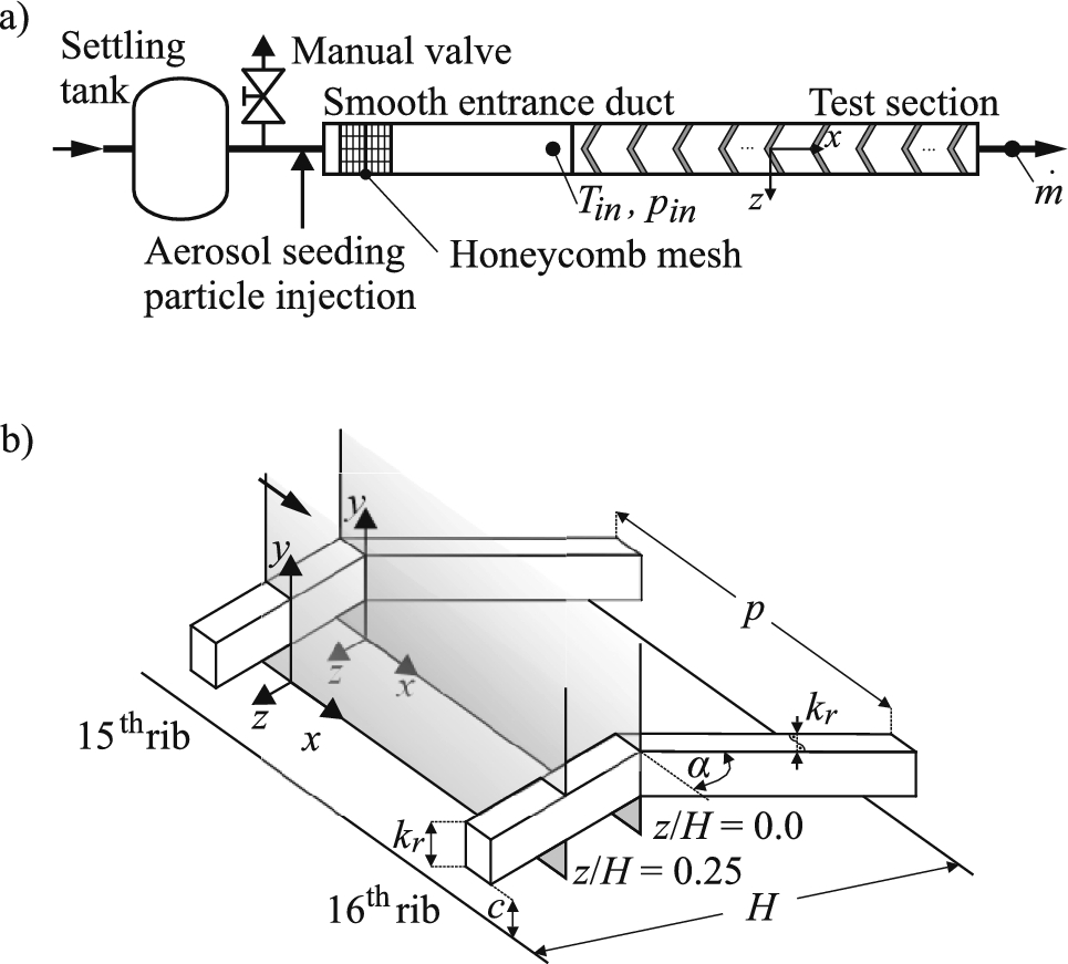 Experimental setup: a Piping diagram of the air loop test facility and b sketch of the test section, nomenclature of the rib configuration. The origin of the Cartesian coordinate system (x, y, z) refers to the respective measurement plane (\(z/H = 0.0\); \(z/H = 0.25\)) and is located in the corresponding measuring plane at the rear side of the divergent rib and the duct bottom wall