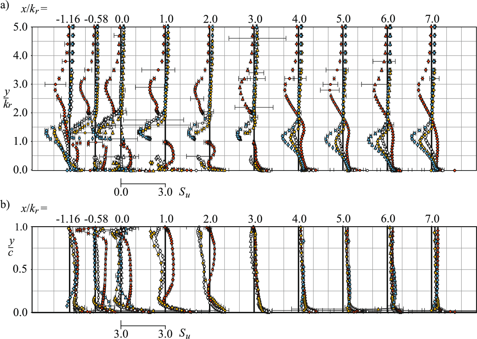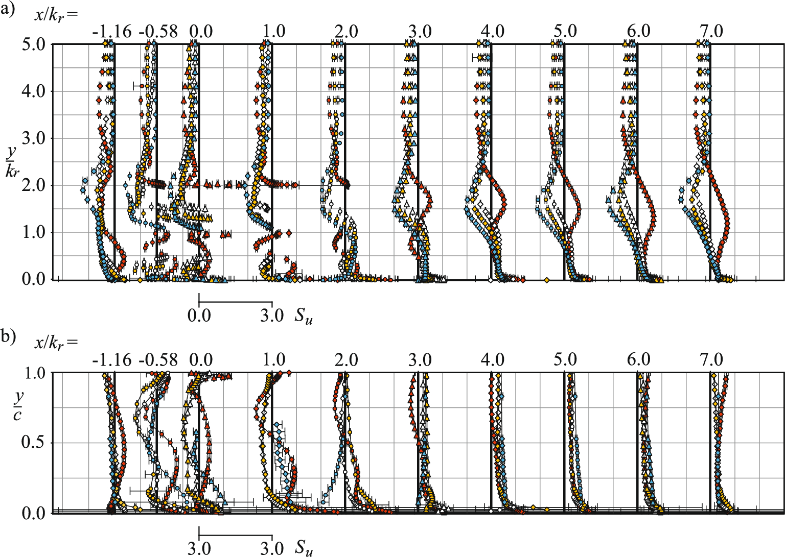 It was interesting to see that below the rib in the gap center (\(x/k_r=-0.58\)), skewness was increased only for \(c/k_r=1.0\). It was hypothesized that high speed flow structures shed at the lower rip tip moved into the gap center. For \(c/k_r=1.0\), the comparable low mean streamwise flow velocities (Figs. 5 and 6) in the gap caused the fluid carried by these flow structures to appear as large-amplitude positive (=high-speed compared to the mean) streamwise velocity fluctuations. On the contrary, for the \(c/k_r\le 0.5\), the flow acceleration in the gap caused high mean streamwise flow velocities without high streamwise velocity fluctuations.