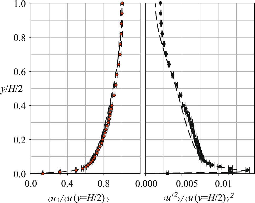 All measurements were taken under nearly steady state conditions. Due to the gradually regulated water-cooled heat exchanger, the time-averaged air temperature \(T_\textrm{in}\) measured upstream of the test section varied slowly by a maximum of \(\Delta T<\pm {0{,}6\,\mathrm{\text {K}}}\) during a test series. The averaged inflow turbulence intensity \(I = \sqrt{1/2 \cdot (\langle u'^2 \rangle + \langle v'^2 \rangle )}/\sqrt{(\langle u\rangle ^2 + \langle v \rangle ^2)}\) in the center at the end of the smooth entrance duct was \(4.2\%\). The normalized mean streamwise velocity \(\langle u\rangle /u(y=H/2) \) and the normalized streamwise Reynolds normal stress \(\langle u'^2\rangle /u_B^2\) of the turbulent inlet flow over the wall distance are shown in Fig. 2. (In the present study, the time-averaged mean velocities in streamwise and vertical directions are denoted by \(\langle u \rangle \) and \(\langle v \rangle \), and the corresponding fluctuations of the instantaneous quantities around their time-averaged means are indicated by \(u'\) and \(v'\), respectively.)