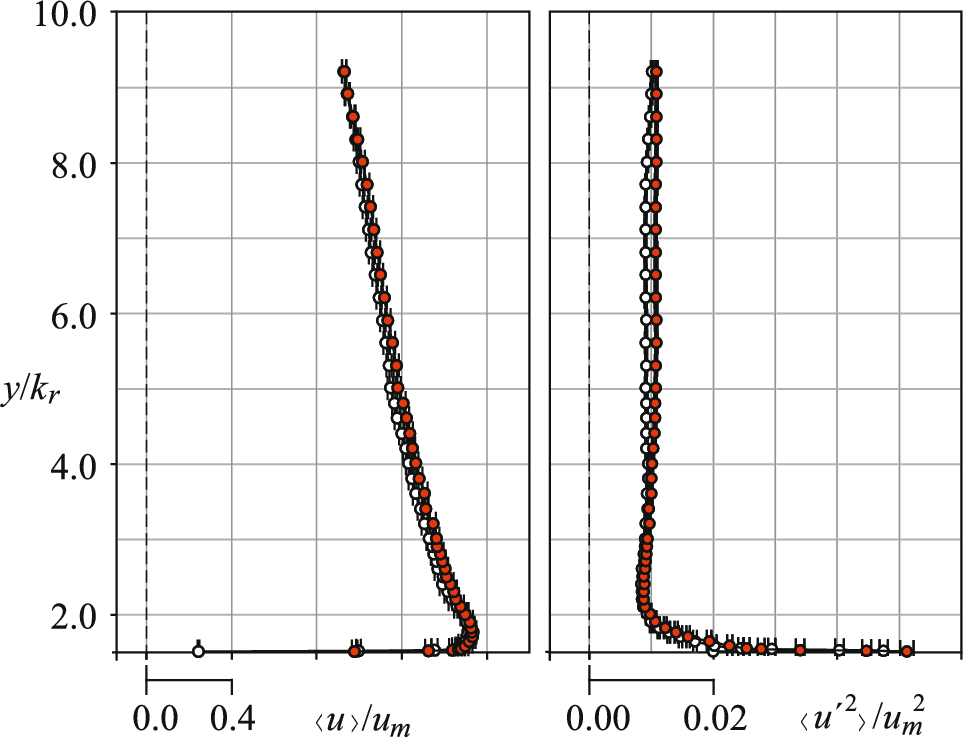 To exclude lateral distortion of the flow field, the symmetry of the flow field relative to the \(z/H = 0.0\)-plane(=duct symmetry plane) in the measuring zone was evaluated by velocity measurements along the z-axis at \(x/k_r = 4.0\), \(y/k = 1.3\) and \(x/k_r = 4.0\), \(y/k_r = 5.0\) for \(c/k_r=0.1\), 0.3, and 1.0. With the exception of the area near the side walls at \(z/k_r > 4.5\) and \(z/k_r<-4.5\), the mean flow field represented by the mean streamwise velocity and mean vertical velocity in Fig. 4 is approximately symmetrical to the duct symmetry plane. The moderate asymmetry near the side walls may be explained by a slightly differently developing flow due to the surface transitions at the duct side walls between the acrylic windows and the aluminum frame. Furthermore, only \(50\,000\) random samples per measurement point were recorded in the regions \(z/k_r > 4.5\) and \(z/k_r<-4.5\) due to the low particle density close to the side walls. Additionally, the wall-normal orientation of the longitudinal axis of the measurement volume resulted in low-quality signals in the wall-bounded shear layers in the immediate vicinity of the duct side walls.