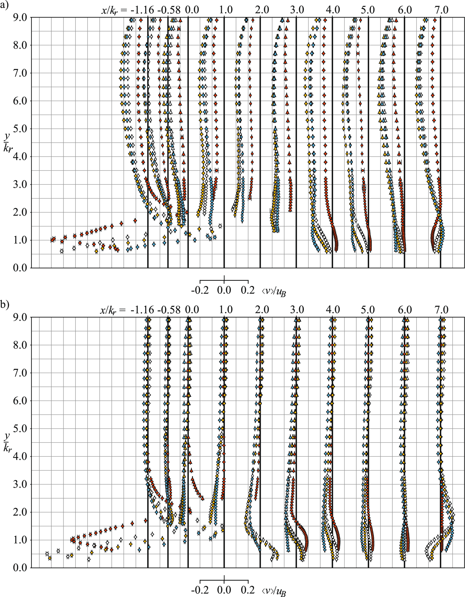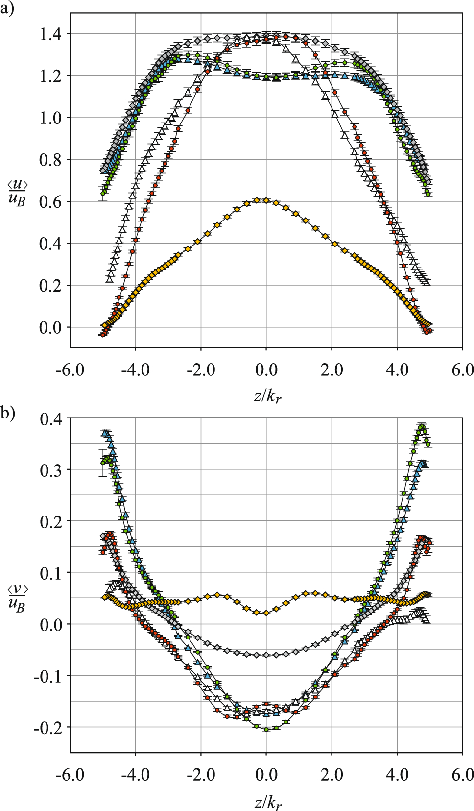 Normalized a axial mean velocity \(\langle u\rangle /u_B\) and b vertical mean velocity \(\langle v\rangle /u_B\) measured along lines parallel to the z-axis at \(x/k_r=4.0\), \(y/k_r=1.3\) for \(\vartriangle \hspace{1mm}c/k=0.1\), and and at \(x/k_r=4.0\), \(y/k_r=5.0\) for , and
