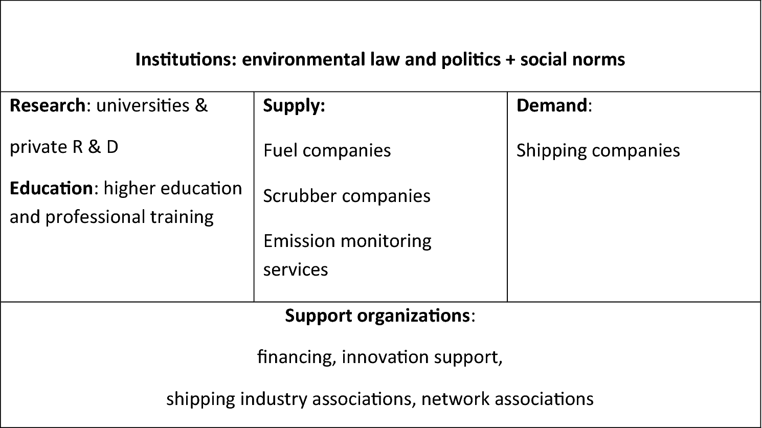 Research: universities and private R&D Education: higher education and professional training | Supply: Fuel companies Scrubber companies Emission monitoring services | Demand: Shipping companies |