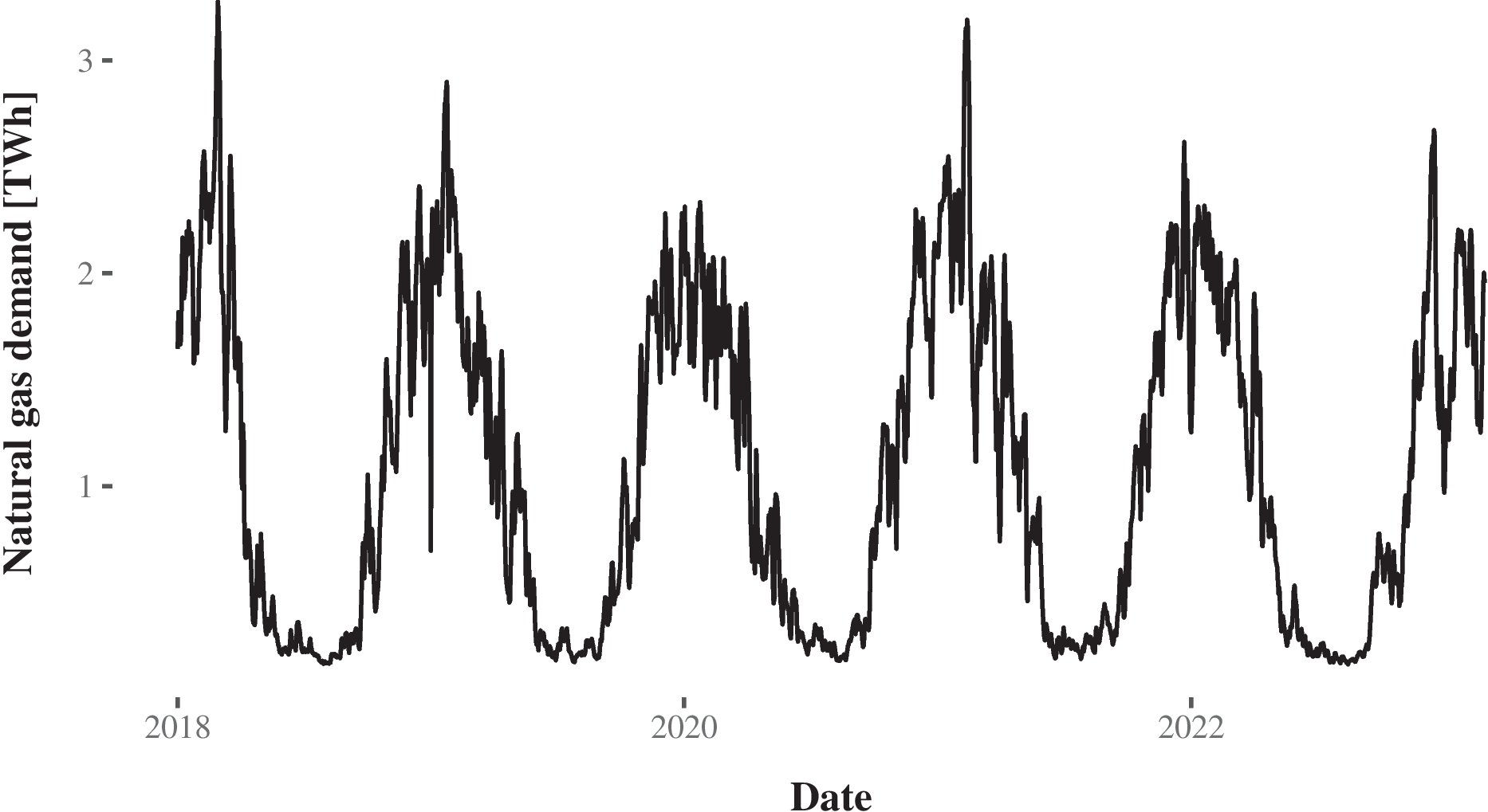 We use the actual daily consumption of all SLP customers in Germany, as it is reported ex-post with a few days lag after realization. SLP demand as calculated by the gas grid operators as the residual load, more precisely as ”the sum of all measured inputs minus all measured offtakes in a network” (Trading Hub Europe, n.d.).1