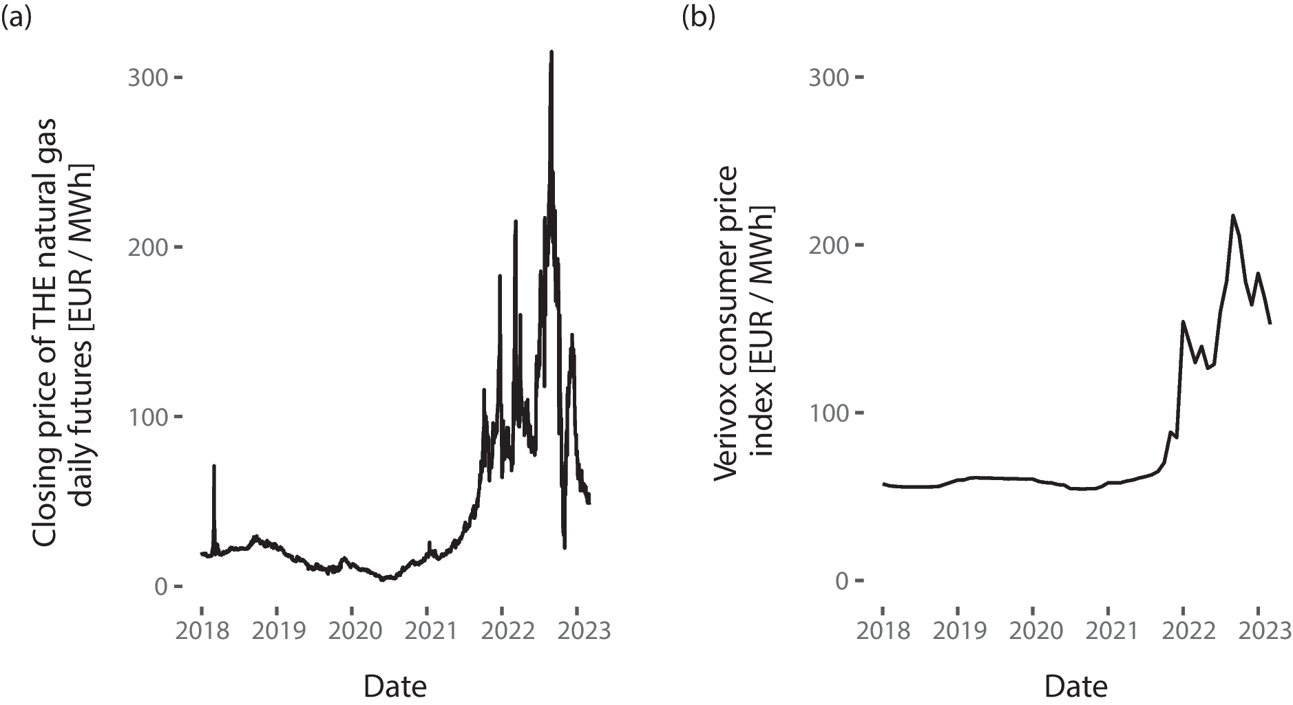Figure 3a shows the wholesale price series from 2018 to 2023. After a supply disruption from the Dutch Groningen field caused a short-run price rally in 2018, prices were relatively low and stable for a long period. In 2021, wholesale prices started to rise, reaching the highest peak in September 2022 following the Nord Stream 2 gas leaks. In the following months, prices fell distinctly before rising to a new spike at the end of the year.