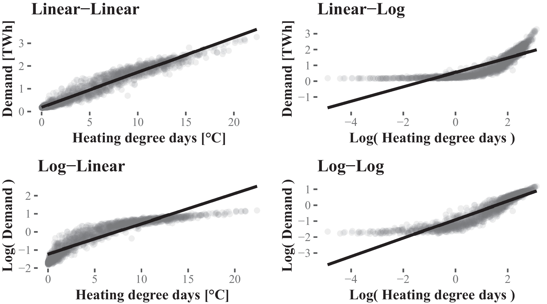 The relationship between demand and heating degree days for different transformations with linear regression lines