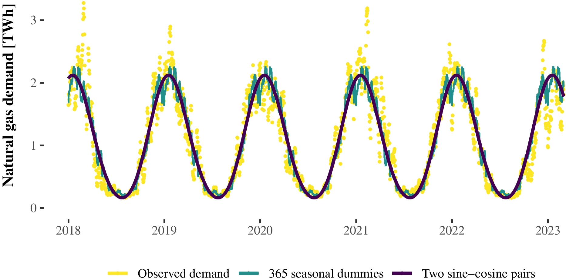 Estimating seasonal dummies on a high frequency with a low number of periods can yield imprecise estimates, as the variances of the dummy coefficients are inversely proportional to the number of observations in each season s. The sensitivity for noise is apparent in the blue line in Fig. 6, where a set of \(T = 365\) day-of-year dummies is fitted to the daily demand series with only five whole periods from 2018-2023.