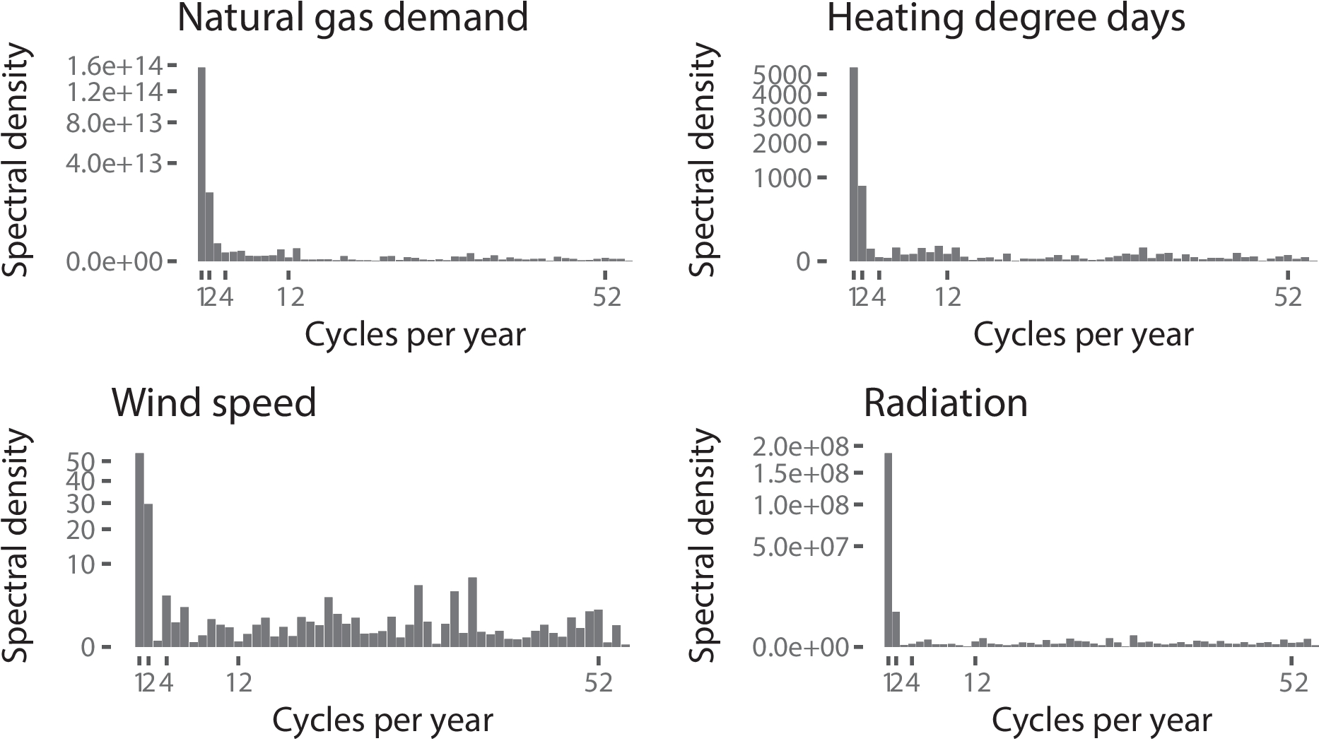 To separate the dominant seasonal patterns from noise and other effects, we turn to spectral analysis of the time series. Using discrete Fourier expansions, Eq. 3 can be represented with pairs of sines and cosines: