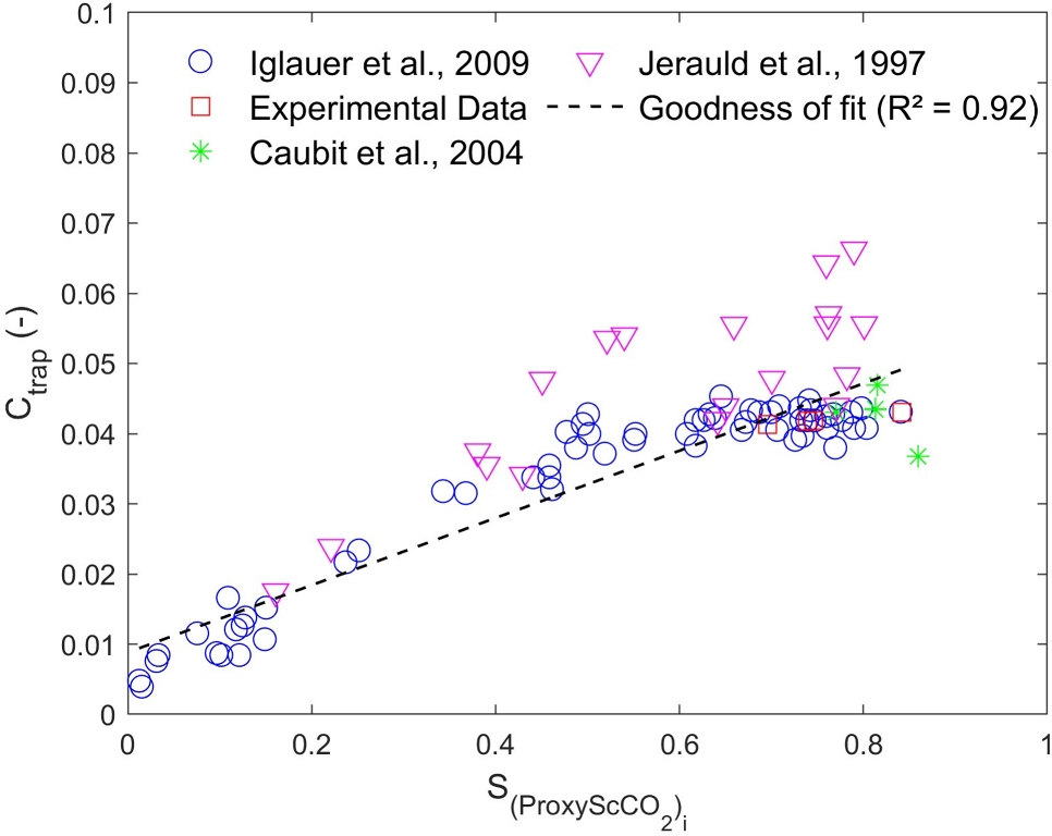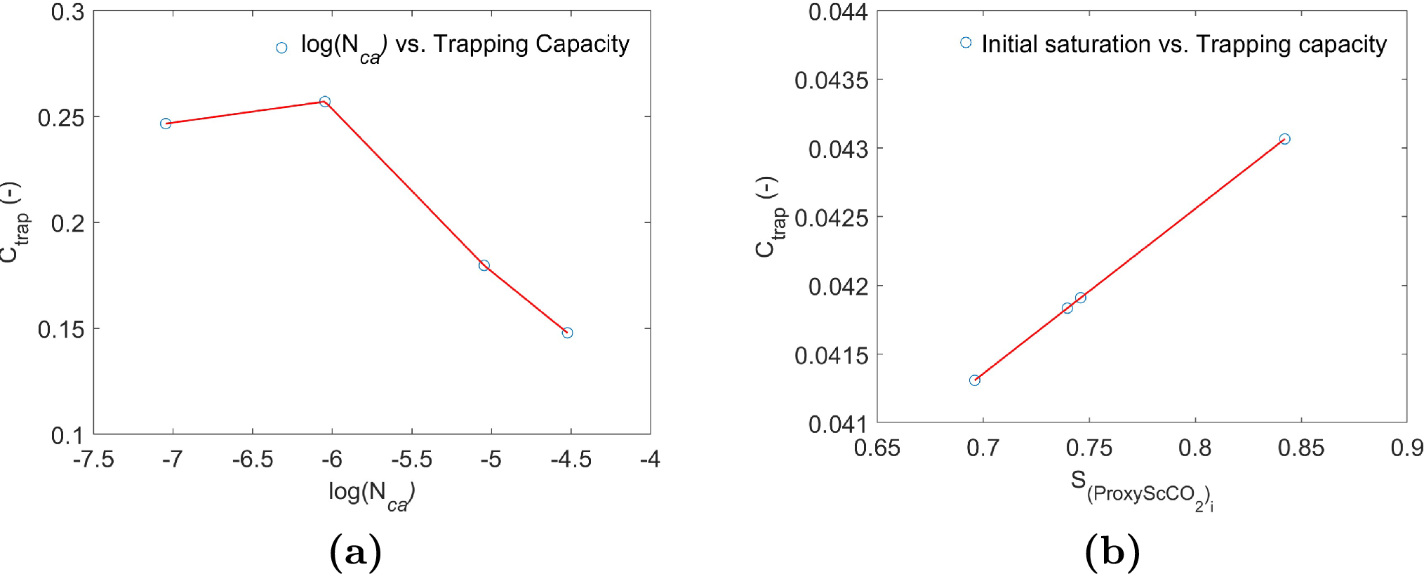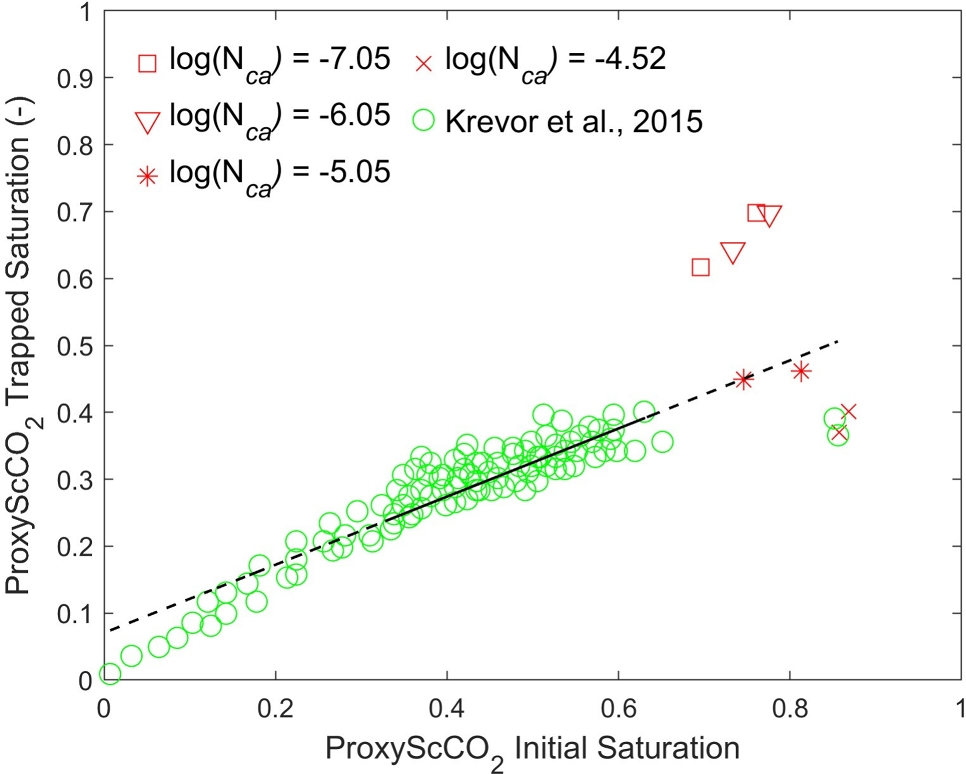 The influence of initial \(\textrm{ProxyScCO}_{2}\) saturation on capillary trapped saturation of \(\textrm{ProxyScCO}_{2}\) after brine injection is an important factor for predicting the efficiency of \(\textrm{ProxyScCO}_{2}\) capillary trapping in saline aquifers (Land 1968). Higher initial \(\textrm{ProxyScCO}_{2}\) saturation generally leads to higher capillary trapping, as there is more \(\textrm{ProxyScCO}_{2}\) available to be trapped in the pore space (Krevor et al. 2015).