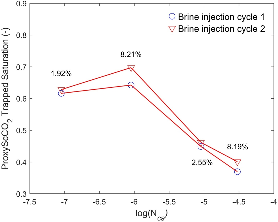 At log(\(N_{ca}\)) = \(-\)6.05, the percentage difference of 8.21% reveals that the trapped saturation in BAC cycle 2 is relatively 8.21% higher than the trapped saturation in cycle 1. Likewise, at log(\(N_{ca}\)) = \(-\)4.52, the increase in trapped saturation percentage difference of (8.19%) represented a considerably higher stratification in cycle 2. These differences are due to variations in initial \(\textrm{ProxyScCO}_{2}\) saturation and demonstrate how BAC cycle-to-cycle conditions can influence the effectiveness of capillary trapping.