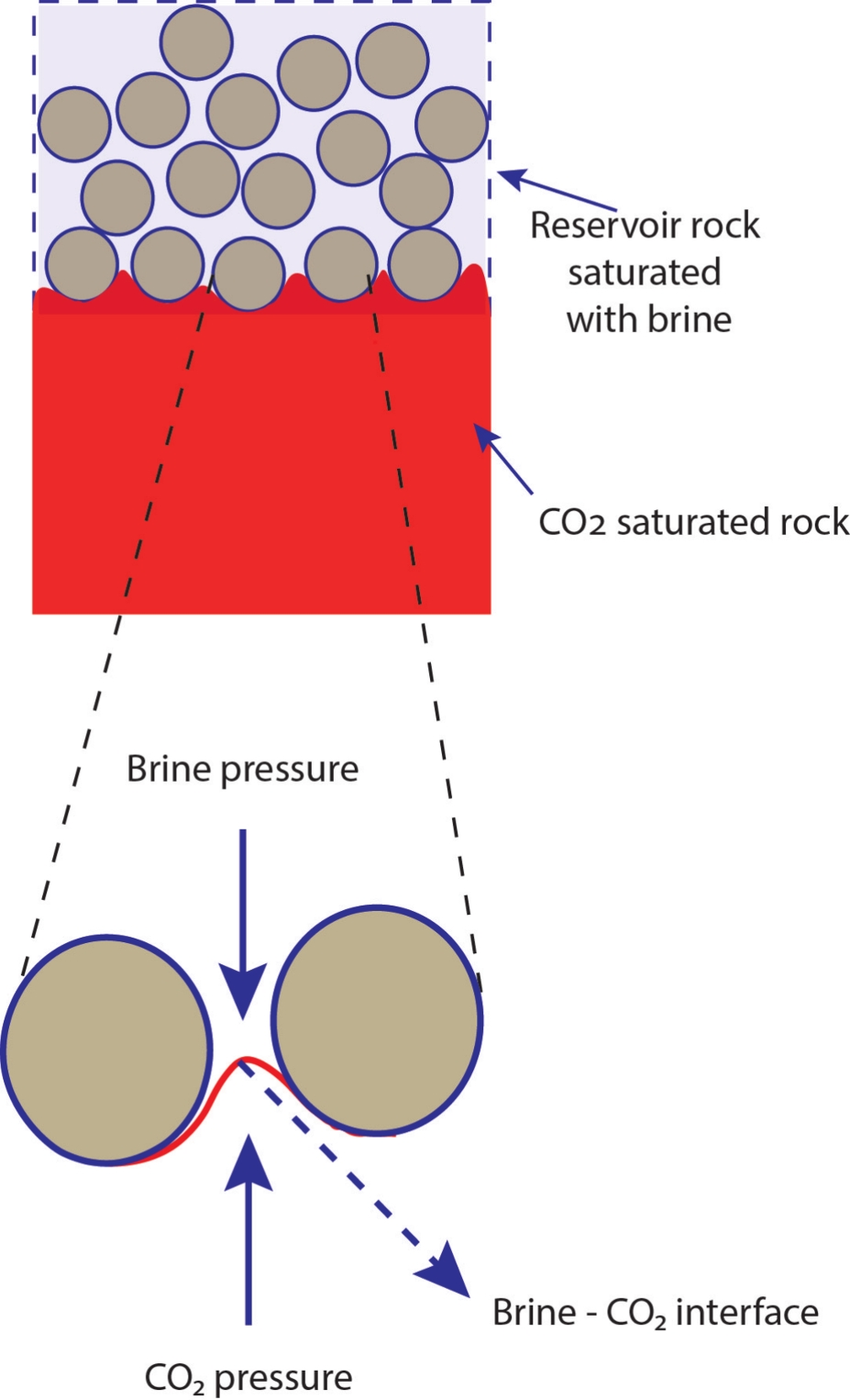 Schematic illustration of brine–\(\textrm{CO}_2\) interface showing the balance of brine and \(\textrm{CO}_2\) pressures that generate capillary pressure in porous media