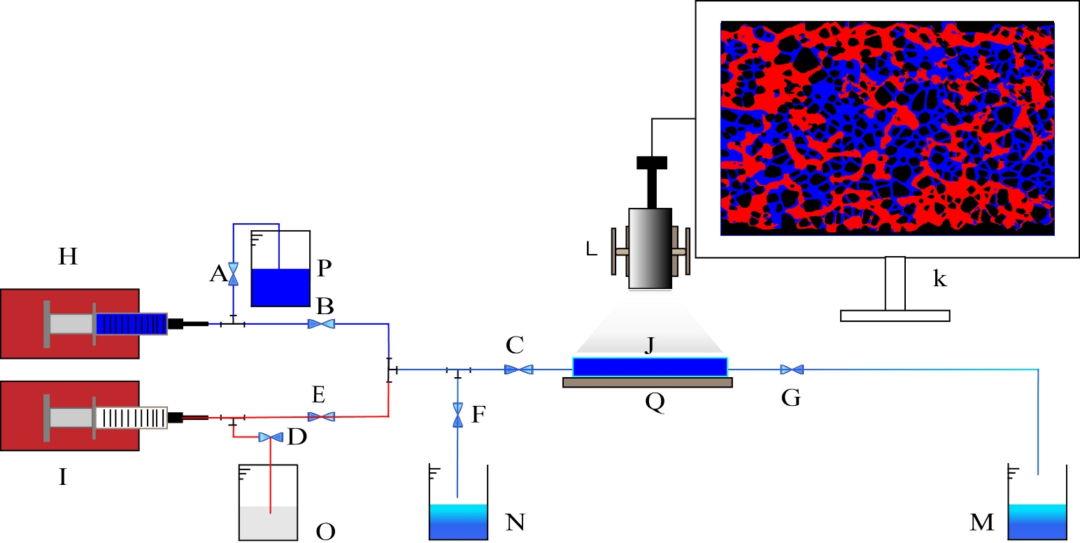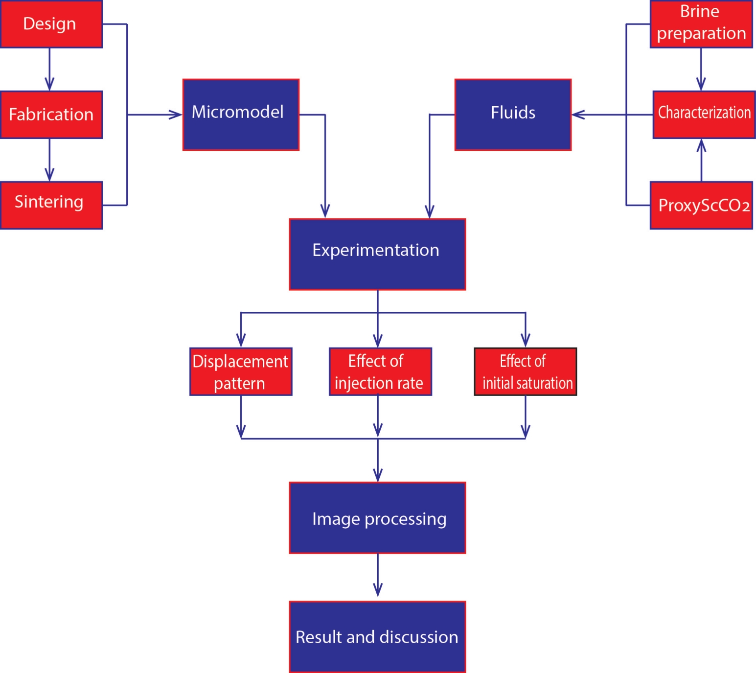 In this study, a two-dimensional micromodel was employed to simulate porous media for conducting BAC displacement experiments by using brine and silicone oil as proxy fluid of \(\textrm{ScCO}_2\). The displacement processes were continuously recorded and subsequently processed into grayscale image sequences. These images were analyzed to quantify the phase saturations of supercritical \(\textrm{CO}_2\) (\(\textrm{ScCO}_2\)) and brine. A schematic representation of the experimental workflow is presented in Figure 2.