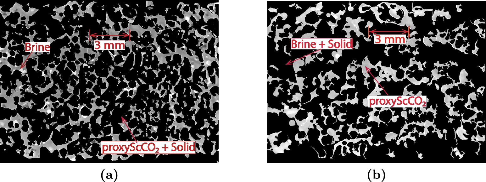 Performed drainage and imbibition core flooding experiment on Berea sandstone using X-ray imaging (350 \(\upmu\)m resolution); examined residual saturation of \(\textrm{CO}_2\) after brine imbibition