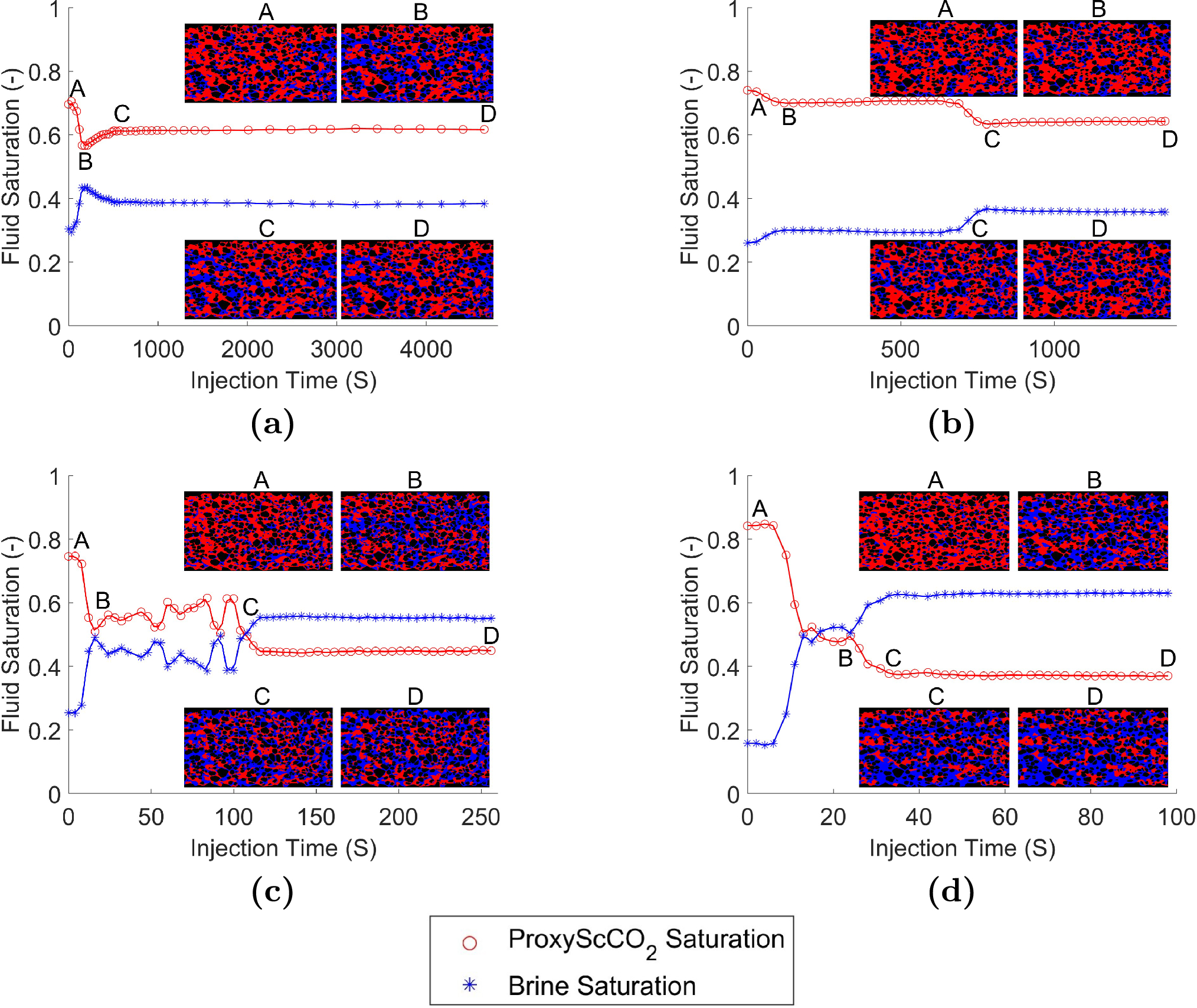 Based on these observations, we can conclude that the injection rate of \(\textrm{ScCO}_{2}\) and brine using the BAC injection technique impacts the displacement pattern; furthermore, at high injection rates, \(\textrm{ScCO}_{2}\) flows in small blobs, whereas at low flow rates, it flows in large droplets. \(\textrm{ScCO}_{2}\) trapping saturation increases as the flow rate decreases, but once the flow rate falls below a certain optimum value, it decreases.