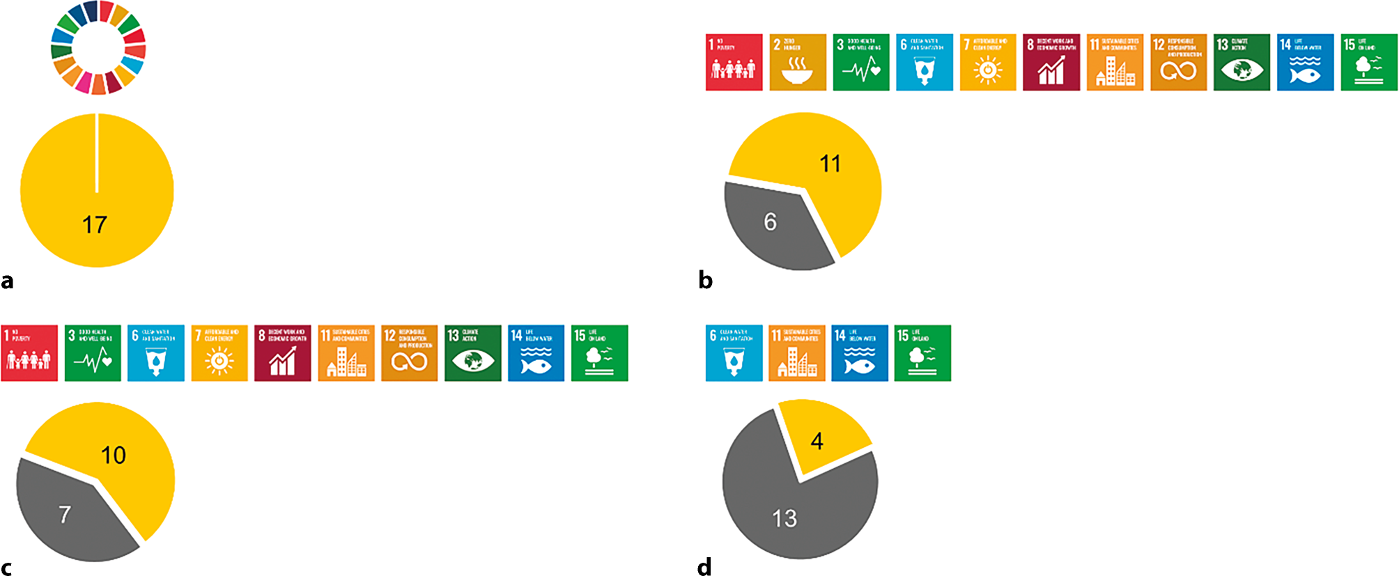 SDGs and their direct and indirect relevance to landfills and waste dumps; relevant SDGs are represented by yellow slices, numbers and icons refer to the related SDGs; a Closing the Dumpsites (Mavropoulos et al. 2016); b Landfills and Waste Dumps (author’s assessment, 2023); c Landfill Mining (Calderón Márquez et al. 2019); d Landfill, Open Dumping and Open Burning Avoidance (Castellani et al. 2022)