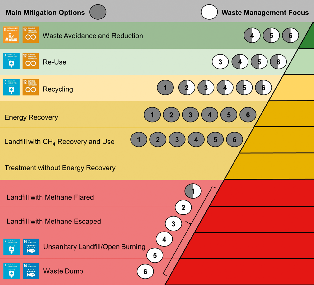 The hierarchy of waste management and the development of its perception in the IPCC assessment reports, adapted from IPCC (2014); numbers symbolize the order of the IPCC assessment reports, i.e., “1” stands for the FAR, etc.; icons symbolise the SDGs directly related to steps of waste hierarchy