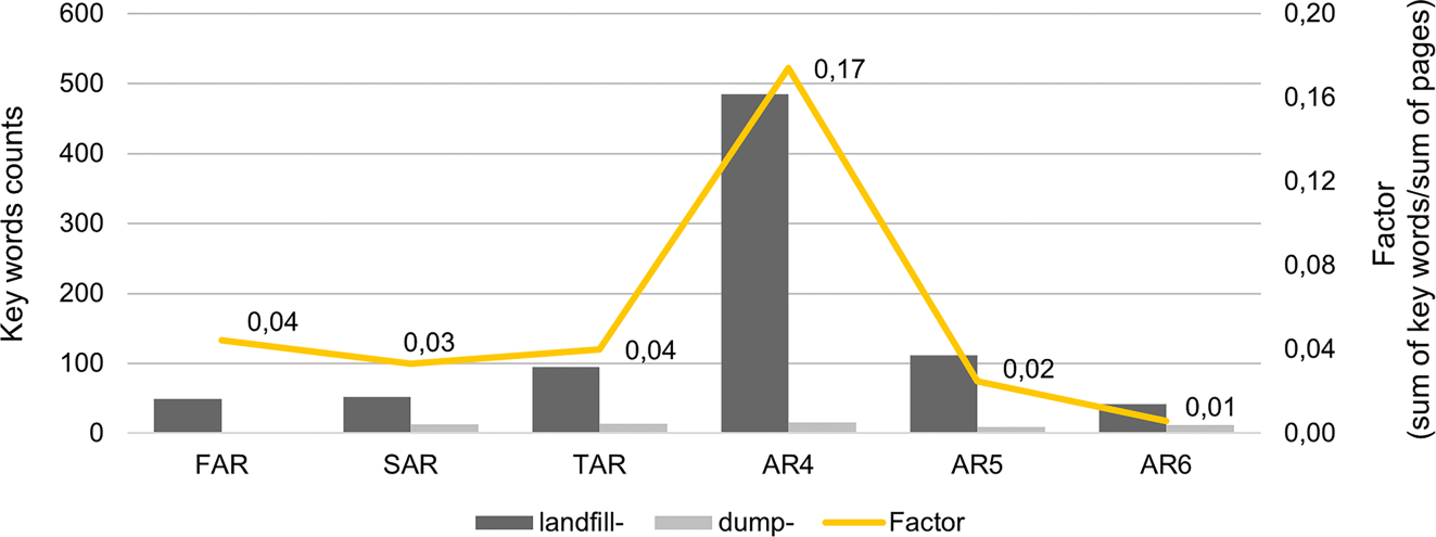 A simple factor was determined to show the relevance of landfills and waste dumps in the IPCC report series. The factor was calculated dividing the sum of certain key words (landfill- and dump-) by the sum of pages of the full IPCC assessment reports, see Fig. 4. The counts of the key words and pages are summarized in the Supplementary Material 2. Landfills and waste dumps remain relevant to climate change, yet they seem to attract less attention in the recent IPCC assessment reports according to the factor. The factors’ increase in the AR4 can be attributed to an additional chapter solely dedicated to post-consumer waste (Chap. 10), while the factors’ decrease in the latest report is caused by declining attention to landfills and waste dumps in terms of mitigation options. Profoundly higher emphasis is put on waste avoidance, which is the opposite strategy in the waste hierarchy triangle. The word waste is becoming to be substituted by the word resource.
