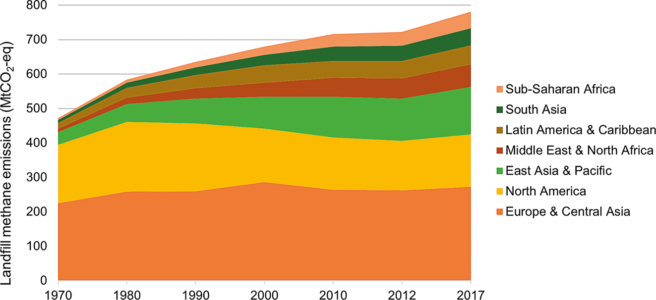 Development of landfill GHGs emissions landfills by region, 1970–2017 (adapted from Zhao et al. 2019; World Bank 2024)