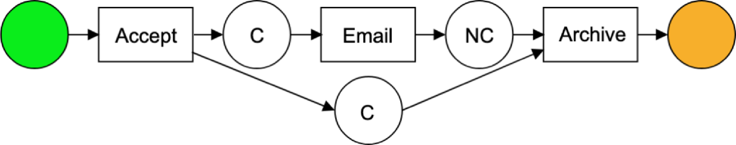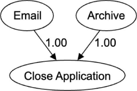 We use \(\xrightarrow {c}\) to denote a causal execution relation. For example, \(A \xrightarrow {c} B\) means that the execution of A causes the execution of B. That is, without A happening B cannot happen, and given we know that B occurred, we can deduce that A had occurred (sometime) before it. It is important to note that any two time correlated occurrences do not necessarily entail a causal execution relation. For example, let’s assume that \(Accept \xrightarrow {c} Email\), and also that \(Accept \xrightarrow {c} Archive\). As a result, the occurrences of Email and Archive will be correlated in the data. However, one cannot deduce a causal execution dependence between these two tasks, even if one always occurs immediately after the other. In our example, the correlation between Email and Archive is spurious, while the correlations between Accept and Email and between Accept and Archive reflect a causal relationship.