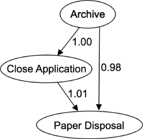 Applying process discovery to the initial steps in this process (i.e., \(Accept, Email, \text {and } Archive\)) can sometimes derive the graphs in Fig. 2. Our intuitive comprehension of such graphs attributes a causal meaning to their edges. That is, the links between the tasks in the graph are typically interpreted as if the execution of the Archive task depends on having the Email task executed first. However, we know that in the real BP (see Fig. 1), such dependency is not imposed, and may have arbitrarily emerged as a result of longer execution times for the Archive task instances in the log.