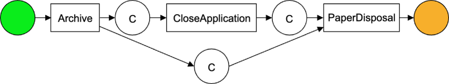 Highlighted view (\(G_{result}\)) for the mediator pattern. Respective to the discovered BP in Fig. 13a, the \(Archive \rightarrow CloseApplication\) relation is annotated as causal (denoted by ‘C’ inside the connecting place), the \(CloseApplication \rightarrow PaperDisposal\) relation is annotated as causal, and the \(Archive \rightarrow PaperDisposal\) relation is new and annotated as causal