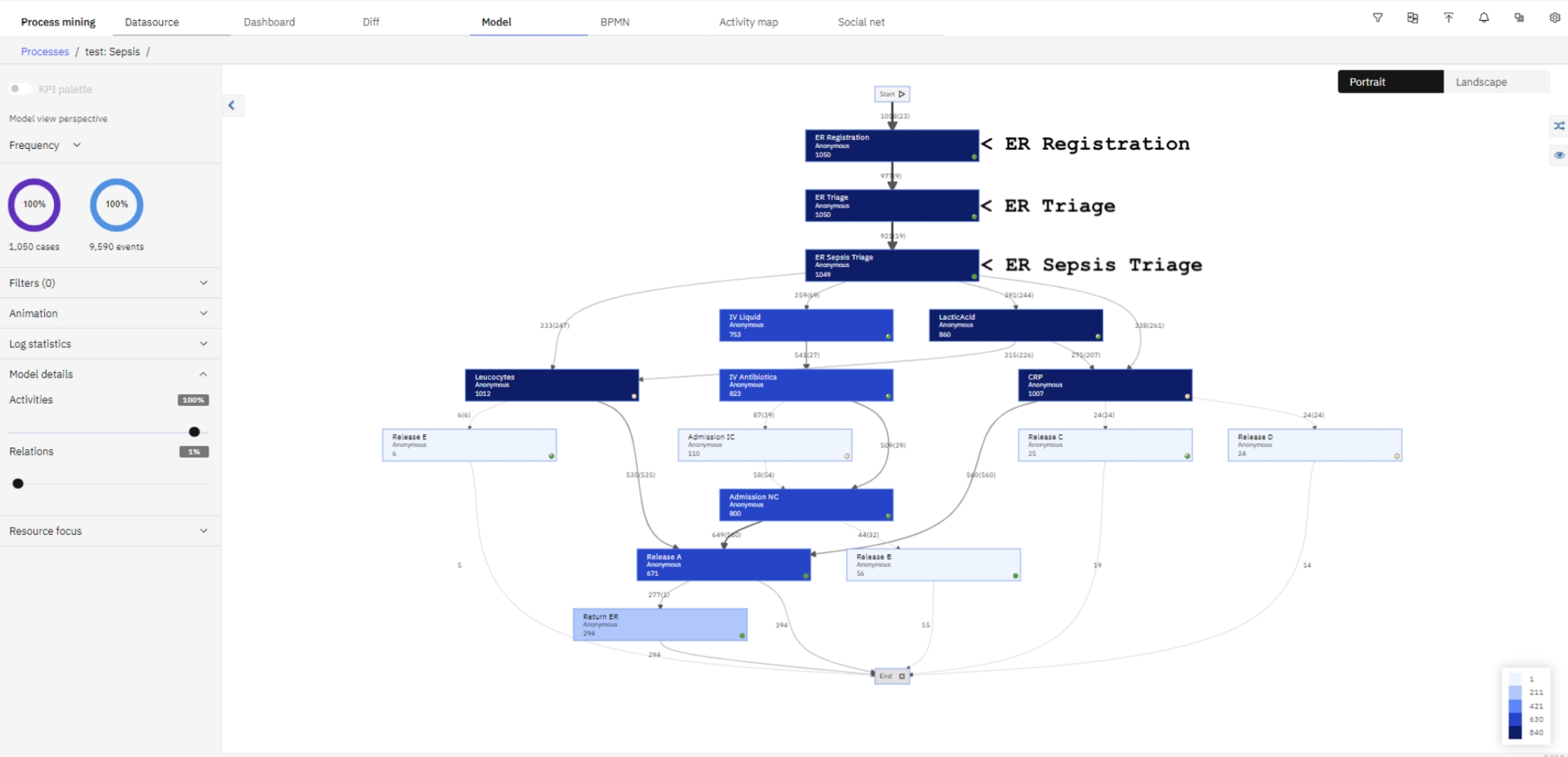 In the second step of the evaluation, examining the hospital Sepsis dataset, we also searched for a situation where CD uncovers a confounder execution pattern while conventional process mining yields a different structure. Both the Heuristic mining algorithm and the IBM Process Mining tool revealed a sequential process structure related to the first three activities in the process: ER Registration, ER Triage, and ER Sepsis Triage as shown in Fig. 16.