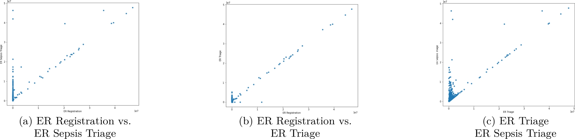 Elicitation of the CBP model for the same three activities yielded a confounder pattern, as shown in Fig. 17. According to this result, we were able to get a confirmation that the execution of both triage activities is determined by the execution of the ER Registration activity in the process. However, the CBP did not show causal execution dependence between the basic triage and the sepsis triage. To investigate this lack of causal execution dependence further, we generated pair-wise XY scatter plots to observe the nature of the correlations among the three activities. The plot results are illustrated in Fig. 18. For the two causal execution dependencies that were denoted by the arrows in the CBP, the majority of points were scattered along the diagonal of the axes in the plots, respectively, as shown in plots (a) and (b), in accordance to the causal execution dependencies in Fig. 17. However, the lack of causal execution dependence between the two triage activities has manifested itself in an interesting ’V’-like shape as prominently depicted in plot (c), with a significant amount of points clustered along the Y-axis. This cluster reflects process execution traces in which the execution of the sepsis triage was lagging significantly behind the execution of basic triage for cases where the latter finished relatively quickly. Such a delay is likely to be indicative of a lack of resources in the process, that is, limited availability of physicians who can attend to patients in the ER soon after the basic triage is concluded to perform the sepsis triage. In fact, but to a lesser extent, the plots also reveal a similar ’V‘ pattern such that for very short Registration task executions, ER Sepsis task durations vary in length. Aside from a resource issue, this could also be attributed to those instances where SIRS was not done/not done properly during registration and required repeating it during Sepsis Triage. Such insight derivation demonstrates the value of detecting and further delving into an investigation of discrepancies between the BP and the CBP views.