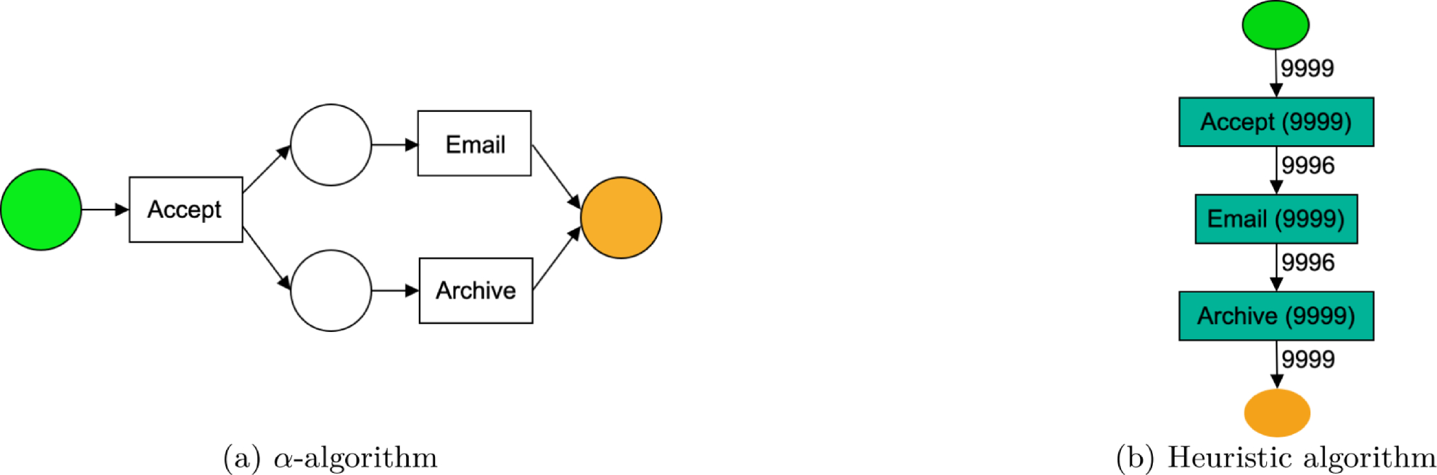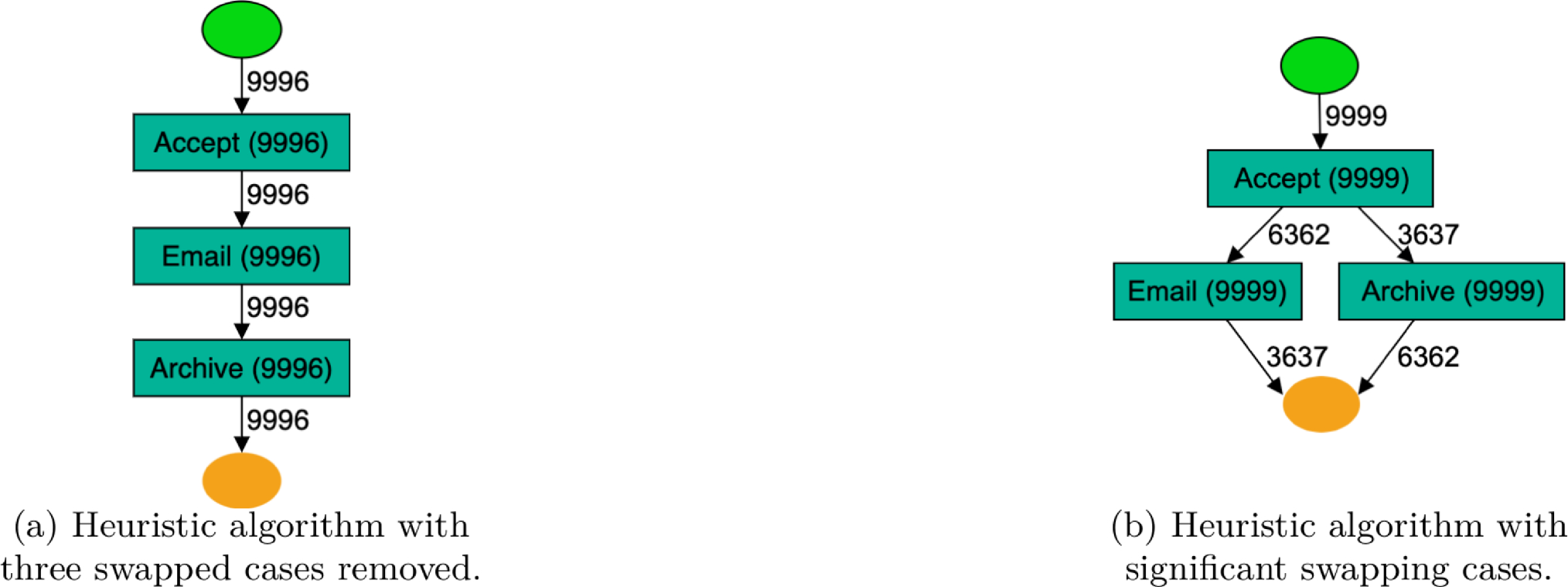 With respect to PD algorithms, we employed \(\alpha\) and Heuristic on the synthetic data. We acknowledge there are more contemporary algorithms, such as Flexible Heuristics Miner (FHM) [36], Inductive Miner [37], and Split Miner [38], being more robust to noisy and incomplete data. For the sake of establishing the core hypothesis, the two algorithms selected are representative, while for the Sepsis analysis, we employed a commercial tool.